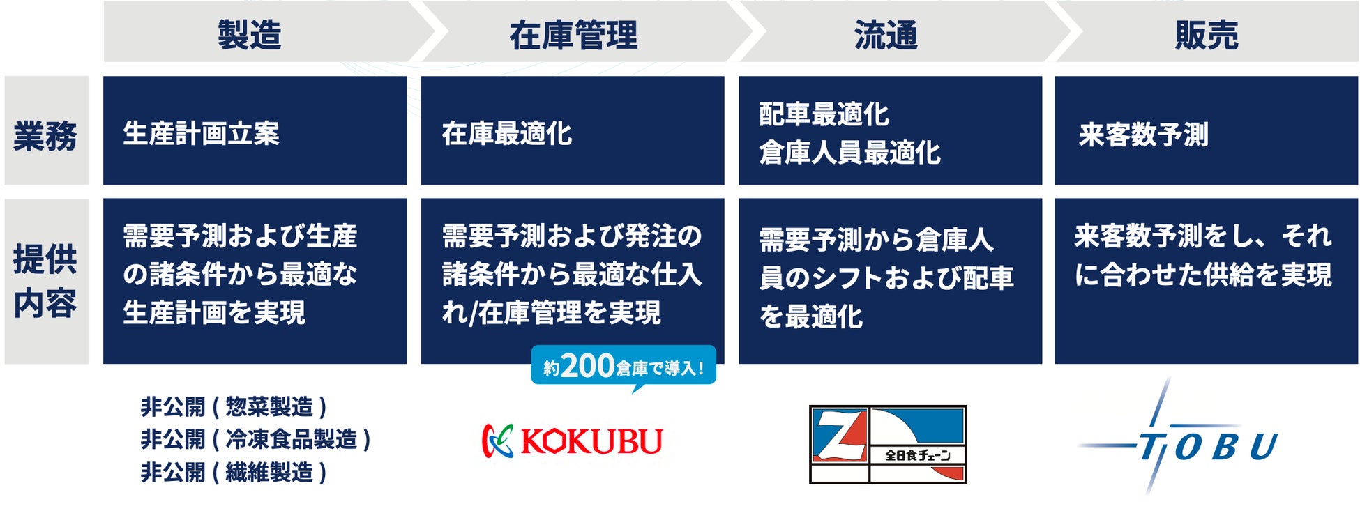 「Perswell」は国分グループ本社の「食品の需要予測」、全日食チェーンの「流通(配車・人員配置)の最適化」のほか、惣菜の生産計画などサプライチェーンマネジメントのさまざまなシーンで活用されています。また、東武鉄道の「特急券の需要予測」やFUJIの「部品調達リスクの予測」、オルビスの「EC梱包サイズ最適化」などでも活用されています。