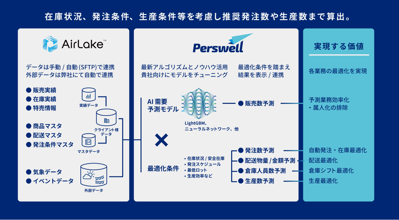 「Perswell」は、ビッグデータを活用し、SCM各所の予測高度化・業務最適化を実現するAIサービスです。