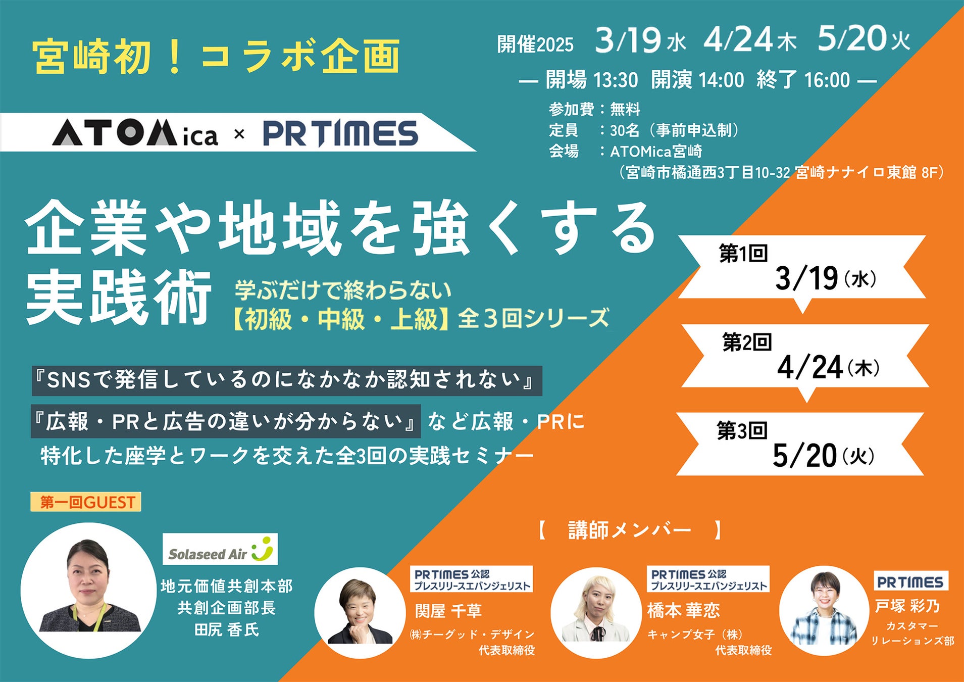 また、今回のセミナーはATOMica宮崎様の協力のもと、宮崎の起業家や地域コミュニティに向けた実践的な広報・PR支援の場として開催されます。また、第一回目のスペシャルゲストとして、ソラシドエア(本社:宮崎市)より、地元価値共創本部 共創企画部長 田尻香様をお迎えし、地元・宮崎での広報活動のお話も交えて、登壇をいただきます。