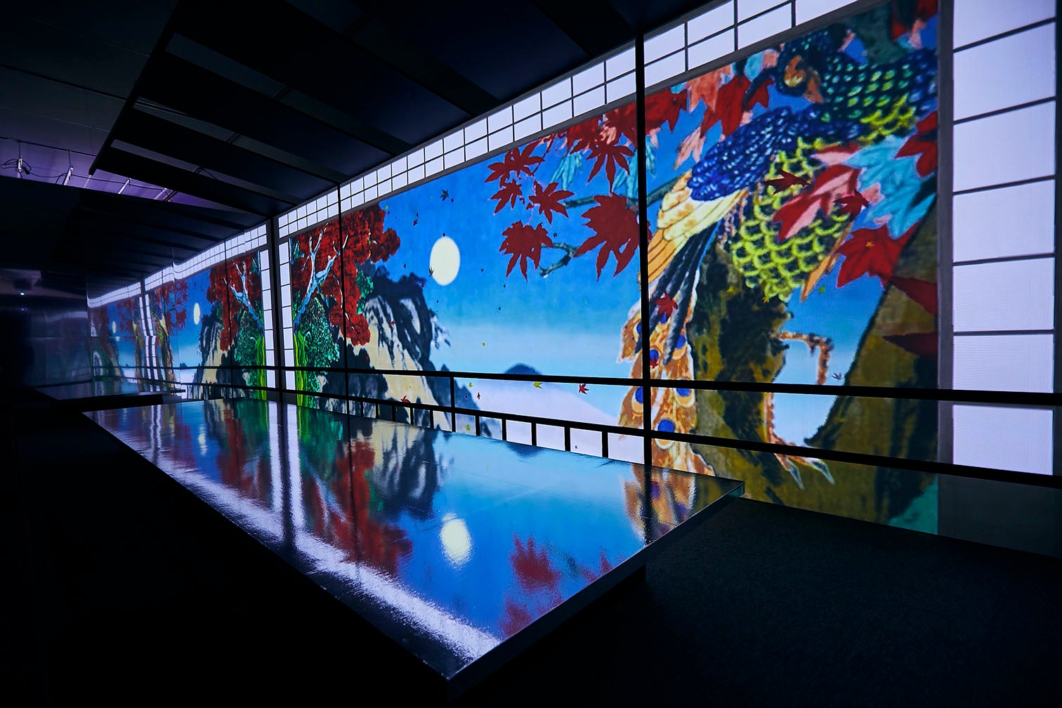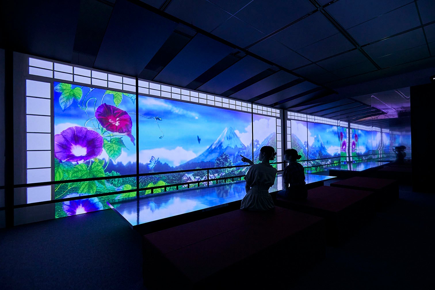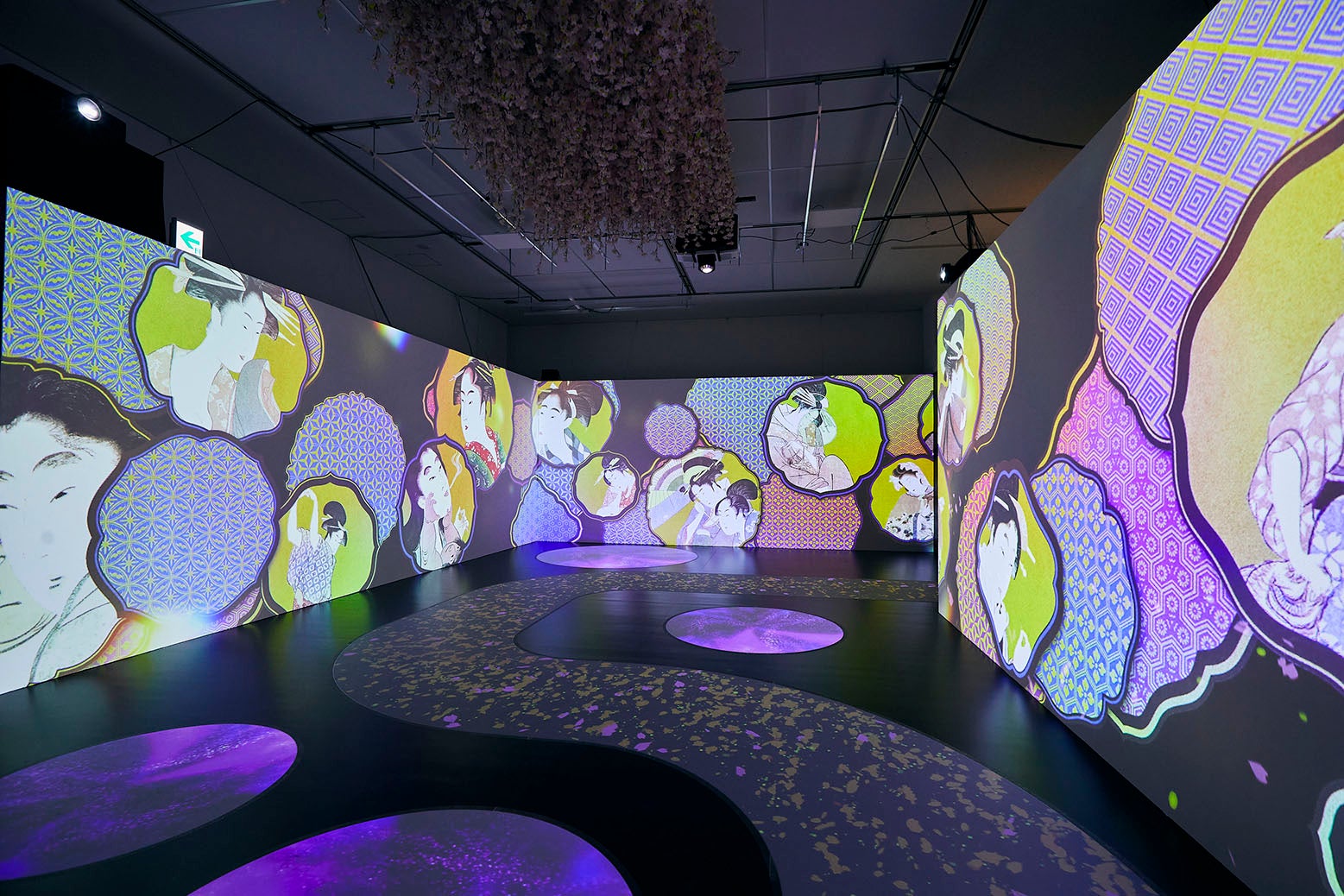 また、美人画と花々で彩る「麗」をテーマとする空間では、喜多川歌麿・歌川国芳・歌川国貞が描いた美人画に描かれた背景を拡張し、花見を楽しむ女性たちの優美な姿をモーショングラフィックスで描きました。