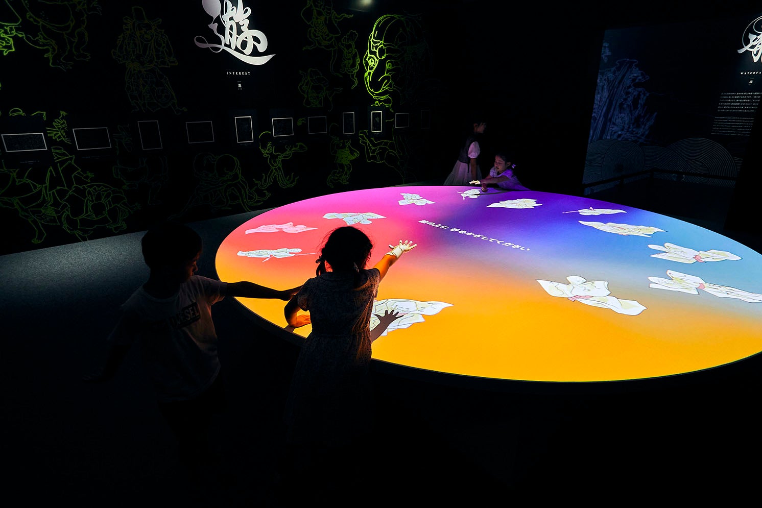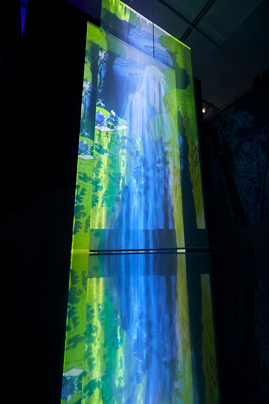 舞台裏では、AIを活用して浮世絵のデジタルデータをより高精細にする手法、江戸時代の色彩を再現する手法、輪郭をなぞり線画にする手法、モーションセンサーによって浮世絵がインタラクティブに動く手法など、浮世絵の魅力を最大限に引き出すさまざまな技術を駆使して多彩なコンテンツを制作するとともに、40台以上のプロジェクターによって複雑な立体映像空間を作り上げています。