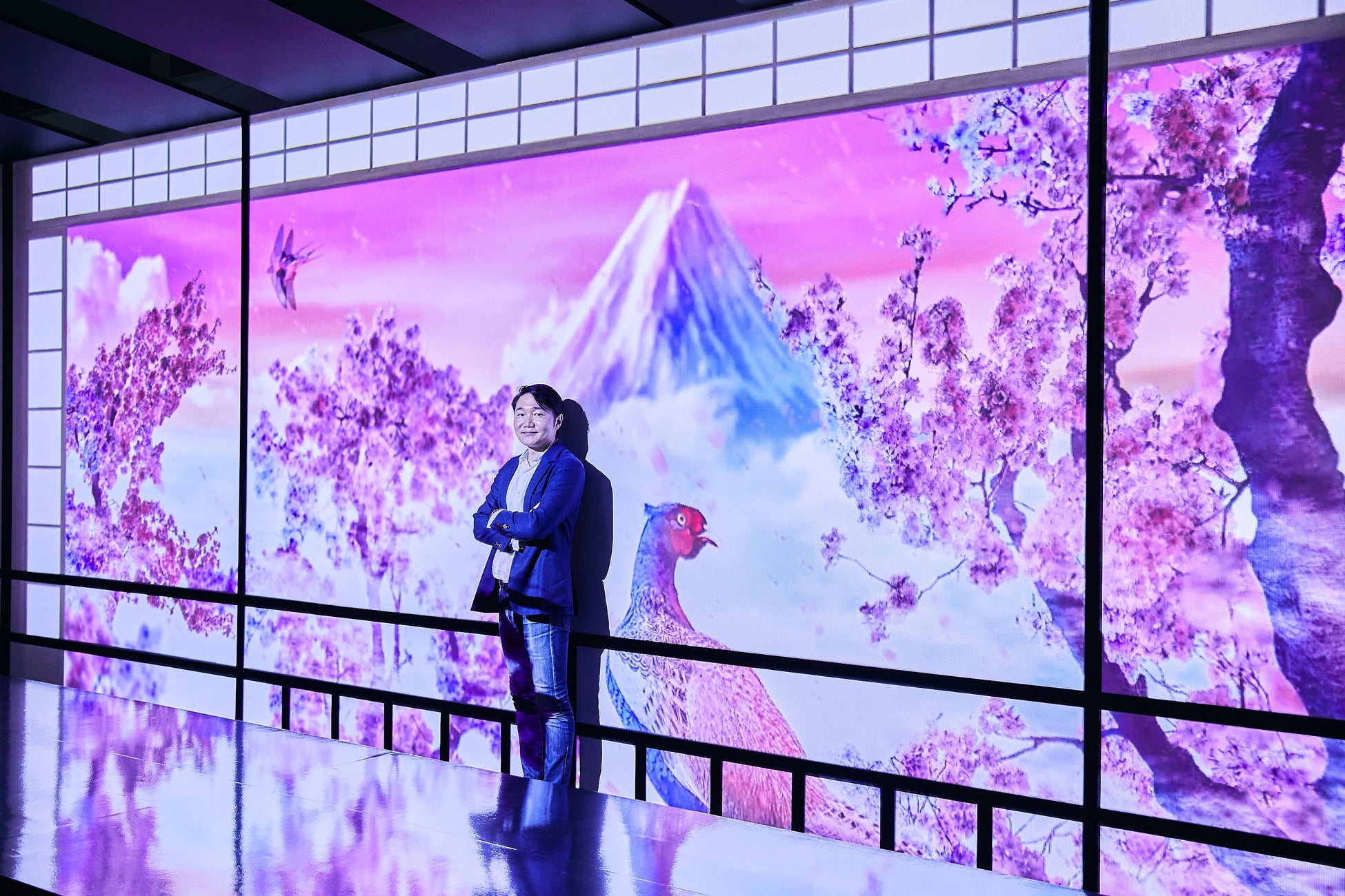例えば、「ジャパン・ブルー」と絶賛される「藍」をテーマとする空間では、歌川国芳の「宮本武蔵の鯨退治」に描かれた平面的なクジラを立体的な3DCGとして描き、ダイナミックに泳がせました。