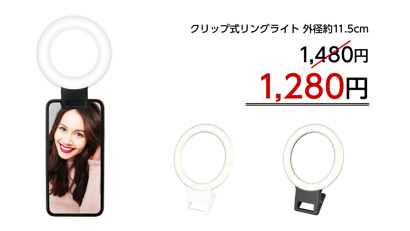 - 【DGPモバイルアワード2022受賞モデル】 約51gと軽量で持ち運びに便利 クリップ式リングライト(外径11.5cm)カラー:ブラック/ホワイト セール価格1,280円(税込) 通常価格1,480円(税込)から200円OFF