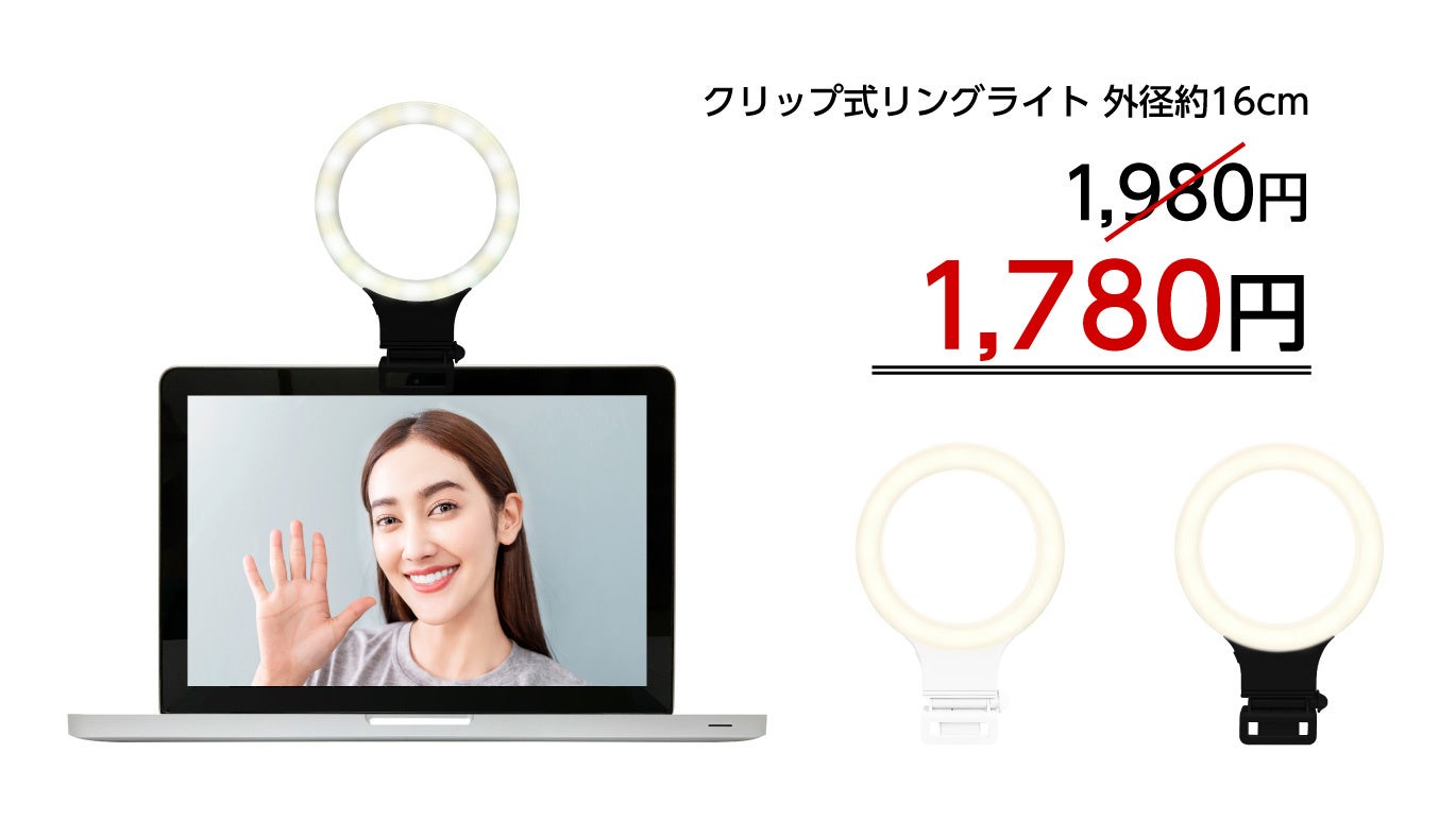 - オンライン会議でも美しい写りを実現 クリップ式リングライト(外径16cm) カラー:ブラック/ホワイト セール価格1,780円(税込) 通常価格1,980円(税込)から200円OFF