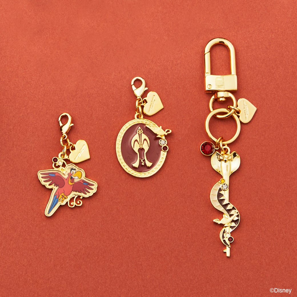 杖をモチーフにしたキーリングとしても使用可能なバッグチャームや、「イアーゴ」・「ジャファー」をデザインに落とし込んだファスナーチャーム。