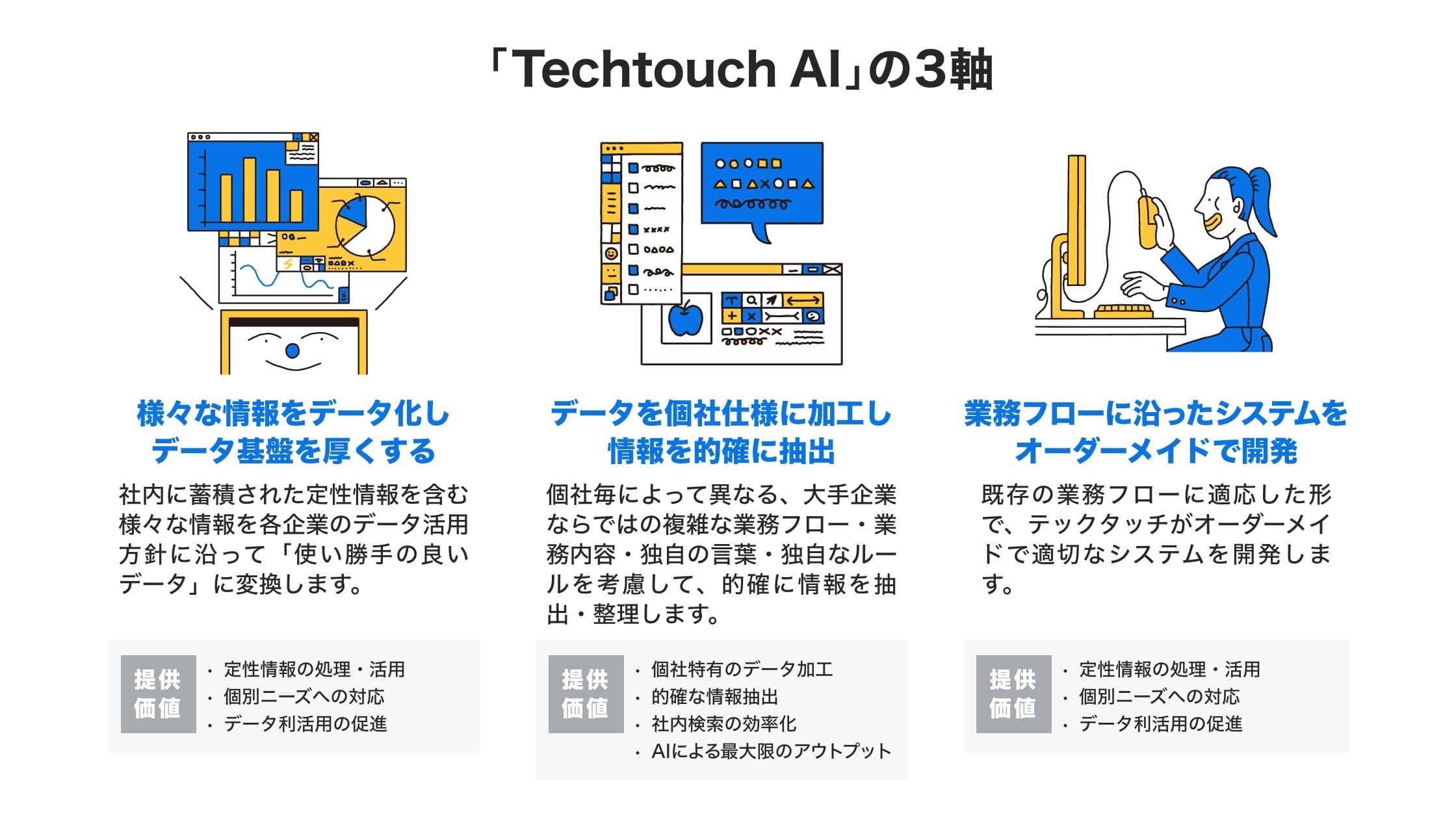 これらの課題を解決し、各社の従業員が業務でストレスなくAIを活用できる環境を構築することで、AIによる生産性向上や事業創造を迅速に実現できる未来を目指し、今回、オーダーメイドAIプラットフォーム「Techtouch AI」をリリースしました。