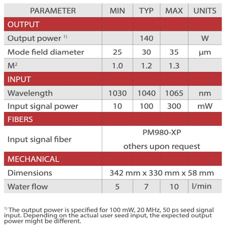 同社の高出力ゲインモジュール「TGModule」シリーズは特許取得済みのテーパー型二重クラッドファイバー(T-DCF)を活用し、最大出力140 W、外部ポンプ対応・シングルモード出力の増幅モジュールで、大面積モードによる非線形効果の低減と高いビーム品質(M²<1.3)を実現します。「AMPX-PW-LP-IR」シリーズは最大出力150 mW、パルス幅20 ps、繰り返し周波数1 MHzに対応し、センシング用途やシードレーザーに最適なレーザーです。最大出力1.5 W(パルスエネルギー 1.5 μJ)、パルス幅50 ps、繰り返し周波数1 MHzに対応した小型グリーンレーザー、「AMPX-PICO-532/100/1 Fiber Laser」、も用意されています。