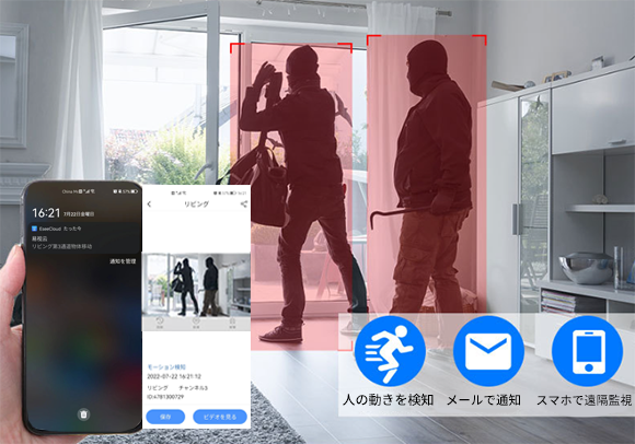 6. 動体検知機能搭載。異常を検知すると、警告音を鳴らしてメールでスマホにお知らせします。