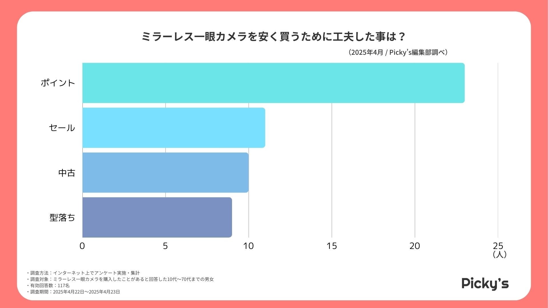 「カメラを安く買うためにどんな工夫をしたか?」という問いに対し、最も多かったのは「ポイントを活用した」という回答(23件)。