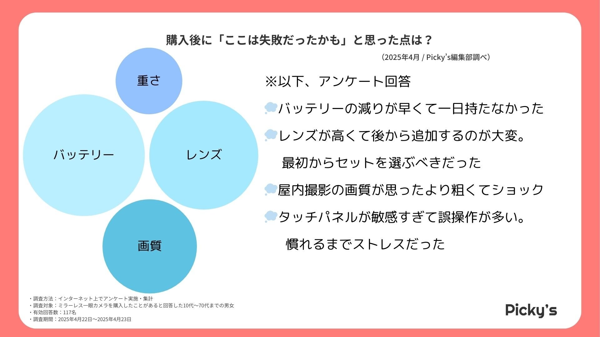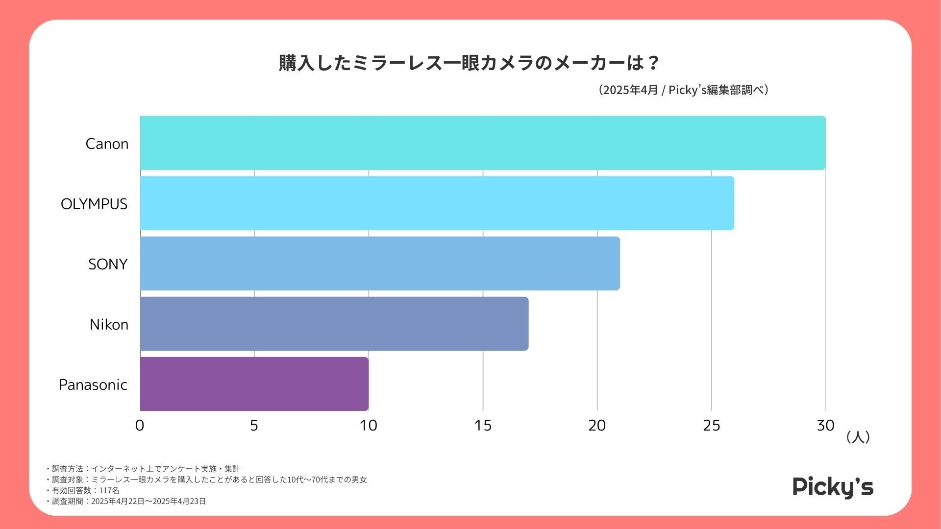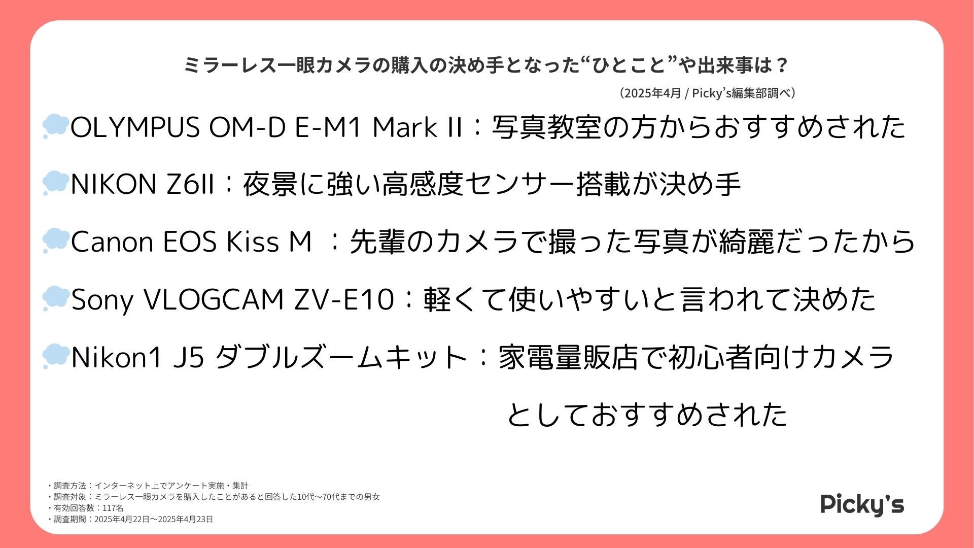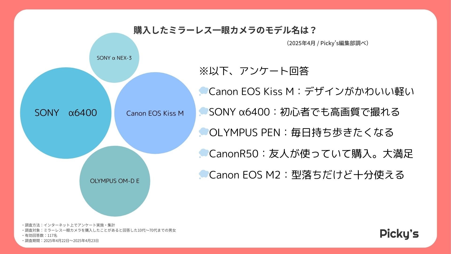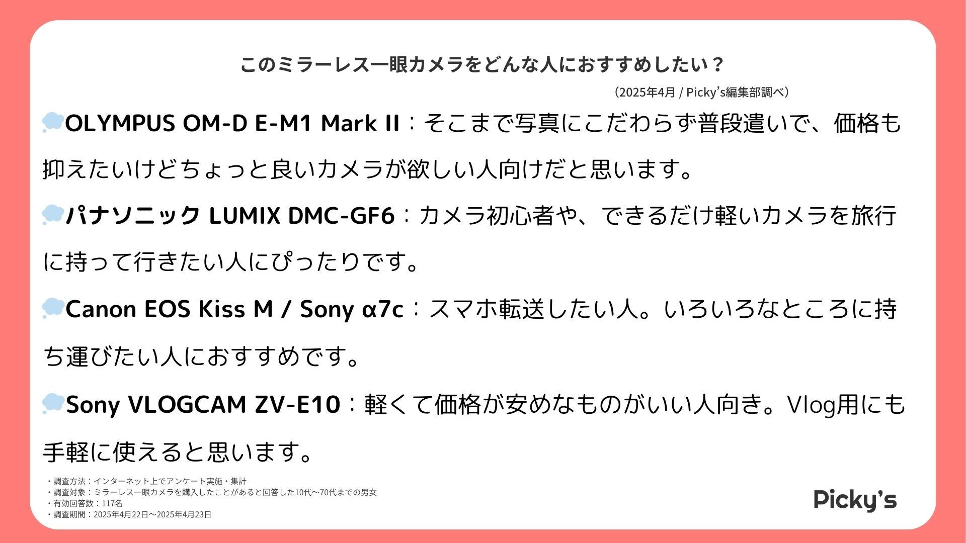 このたびPicky’s(https://picky-s.jp/)およびPicky’s Life(https://pickys-life.jp/)では、インターネット上でミラーレス一眼カメラに関するアンケート調査を実施し、その結果を発表します。