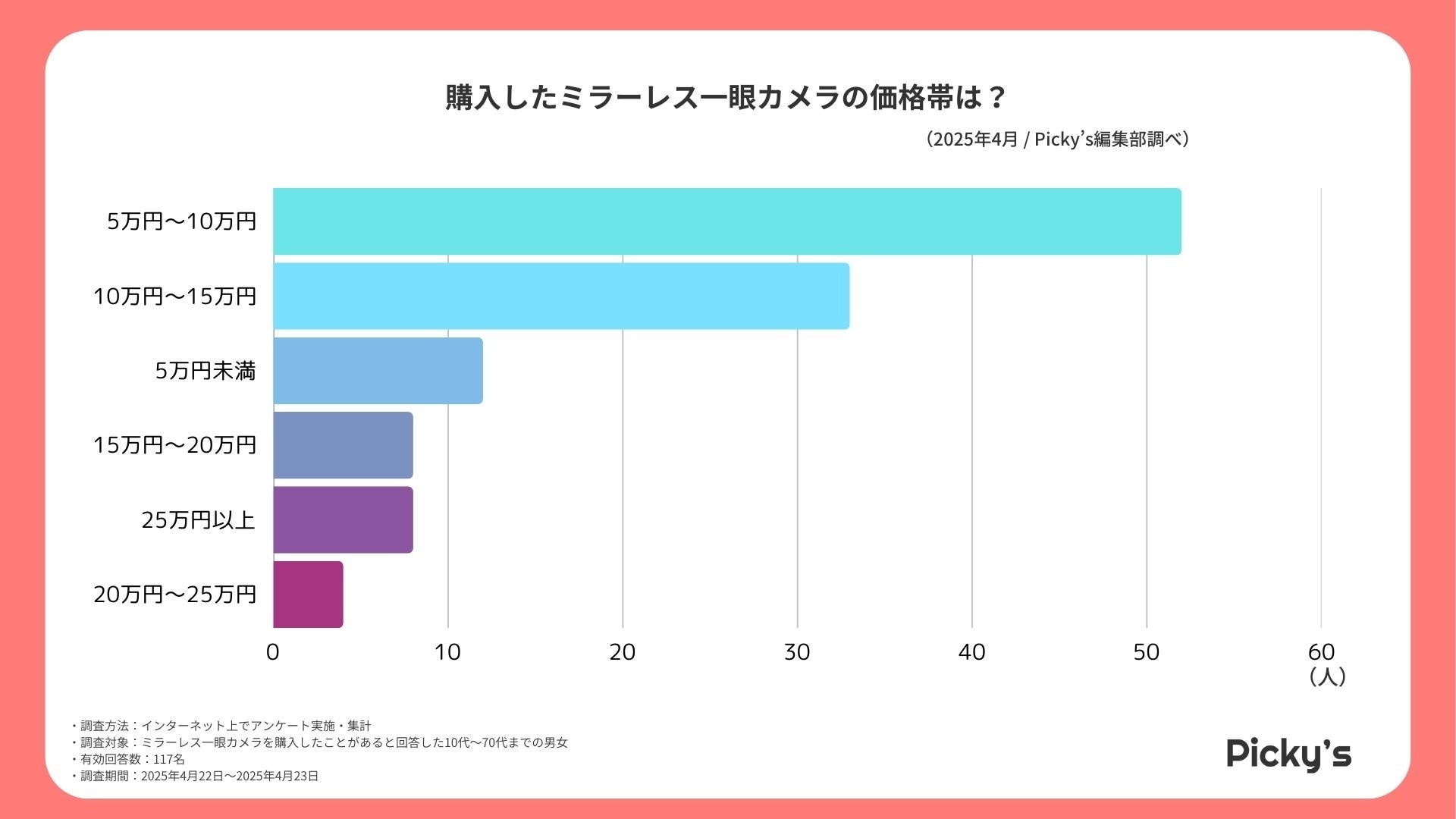 アンケート結果から、ミラーレス一眼カメラの購入者のうち最も多かった価格帯は「5万円~10万円(52件)」で、全体の約45%を占めました。