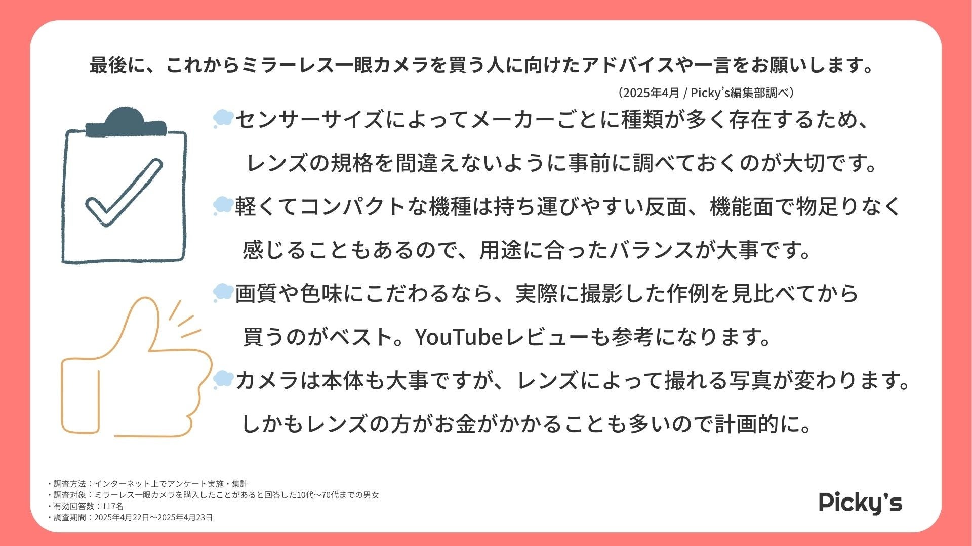 これからミラーレス一眼カメラを購入しようと考えている人へのアドバイスには、「スマホとの連携」や「レンズの選び方」といった実用的な観点が多く見られました。