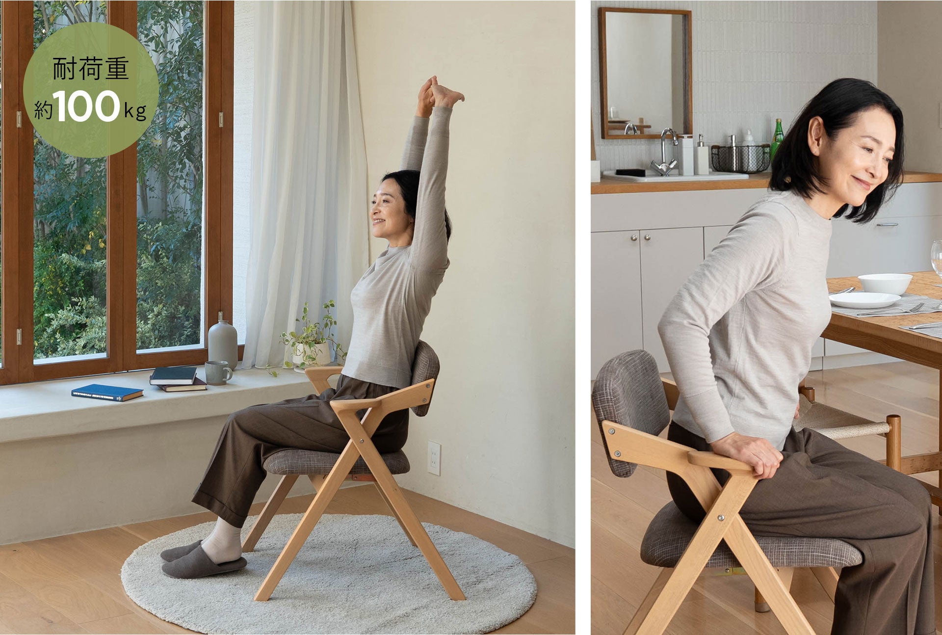 食事中は腰をしっかり支え、ダイニングで過ごす休息時間には少し体をあずけると、胸まわりまでやさしく支える構造。そのため、長時間座っていても疲れにくく、「食べる時間」と「少し休む時間」を、自然に切り替えることができます。