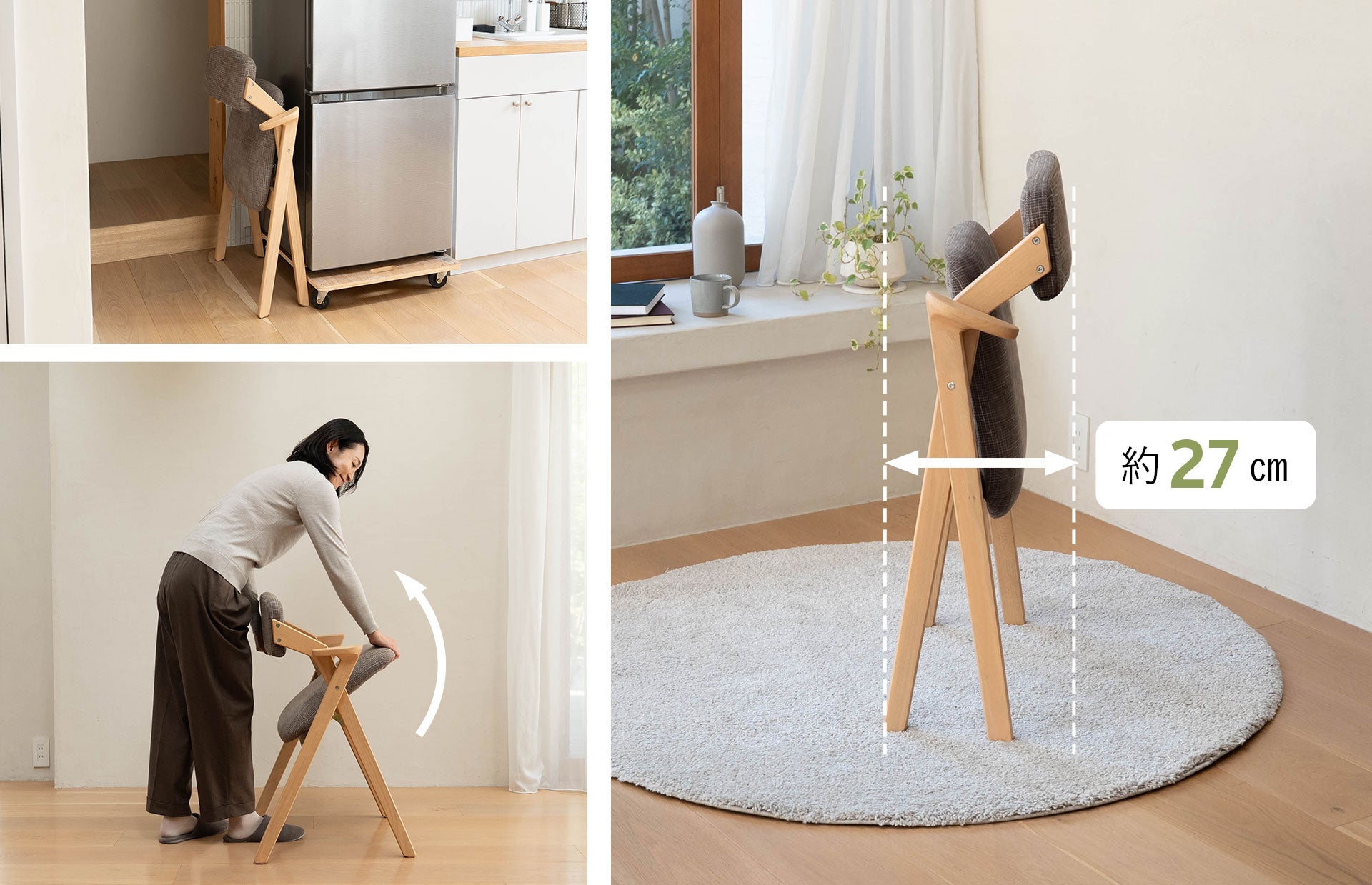折りたたむことで、肘掛け付きのチェアとしては最薄級の約27cmに。家具のすき間や壁際に収まります。普段はすっきり片付け、必要な時だけ使えるため、生活感を抑えた上質な空間を保てます。