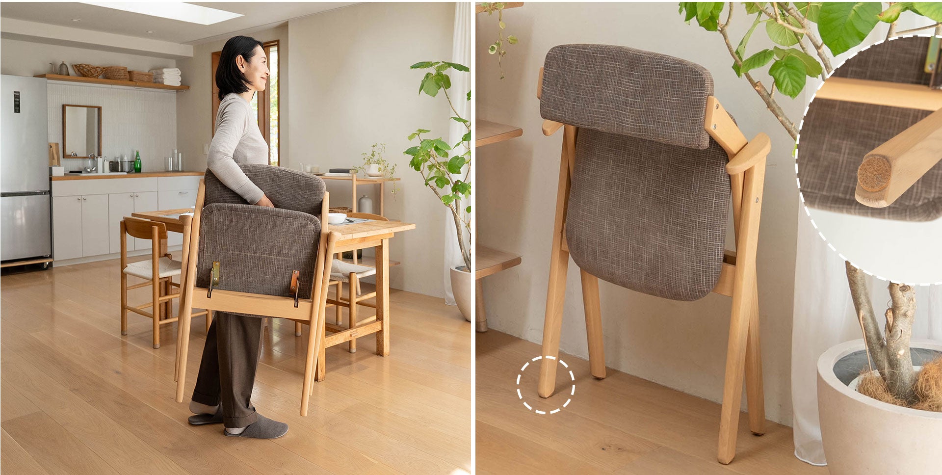 折りたたみ時に自立して倒れにくい設計。壁際に置いておいても、生活感を感じさせないデザインです。高齢のご両親が訪れた時や、少し腰掛けたい場面にもさっと用意でき、インテリアの雰囲気を損ないません。また脚先には床傷防止フェルトを装着。フローリングや畳を傷つけにくく、動かす際の音も立ちにくいため、ダイニングや和室など場所を選ばず安心して使用できます。