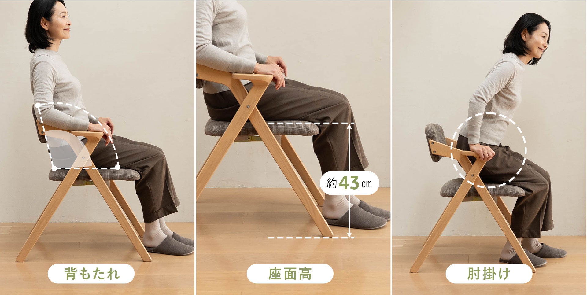約43cmと一般的なダイニングテーブルで使いやすい高さに設計。ご高齢の方でも足裏が床につきやすく、座ったときの安心感と立ち上がりやすさを高めています。