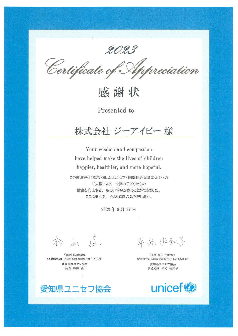 贈呈式では、愛知県ユニセフ協会より、感謝状を授与されました。この度の感謝状授与の名誉を励みに、より一層、地域/社会に貢献できる企業を目指してまいります。