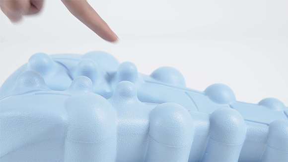 逆に筋肉が柔らかい背中に当たる8つは面積を“大きく”位置を“低く”することで、重力を調整して的確な指圧を再現しています。
