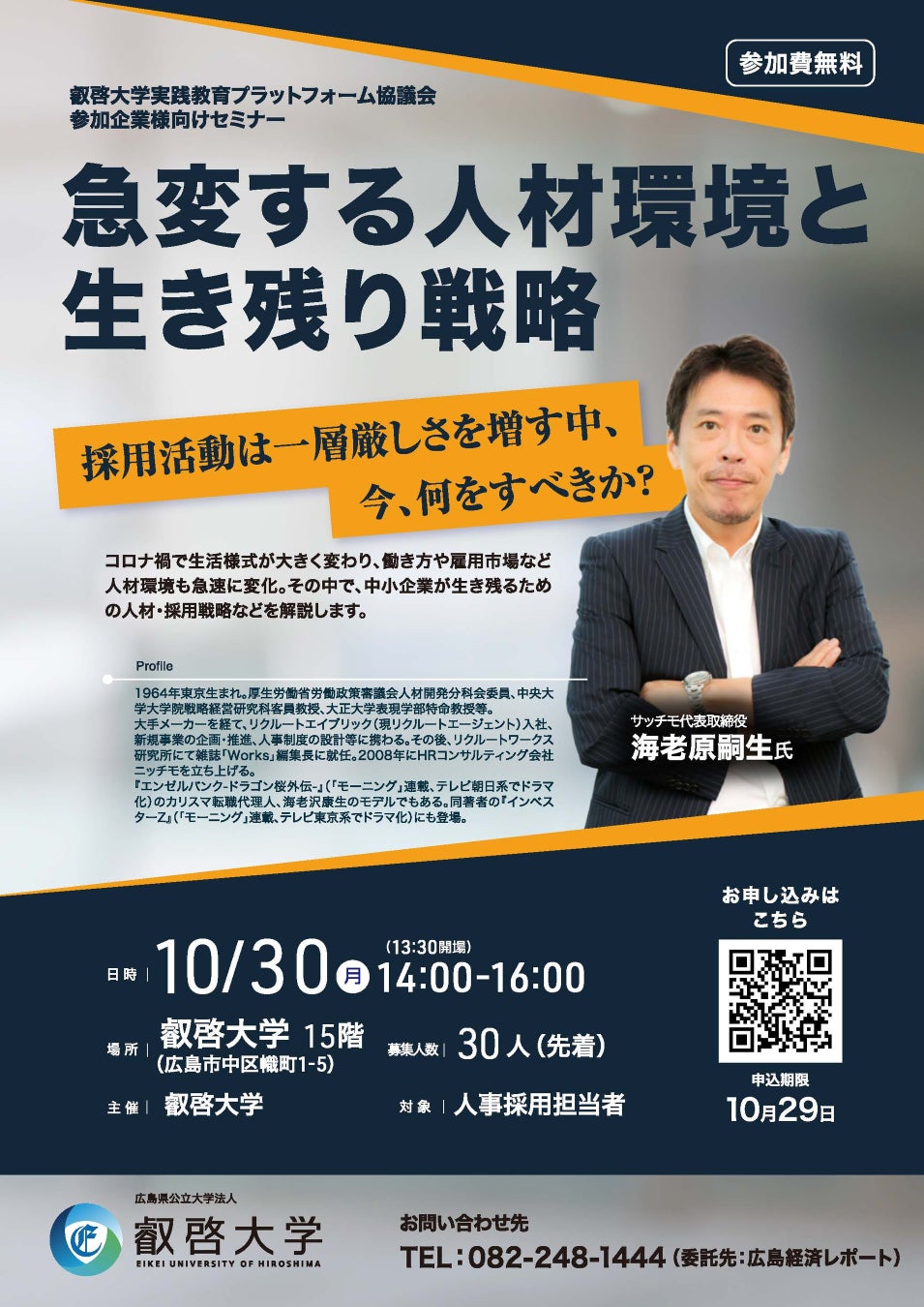 叡啓大学(広島市中区、学長:有信睦弘)では、2023年10月30日(月)、叡啓大学実践教育プラットフォーム協議会 会員様向けに「急変する人材環境と生き残り戦略」をテーマにセミナーを開催します。