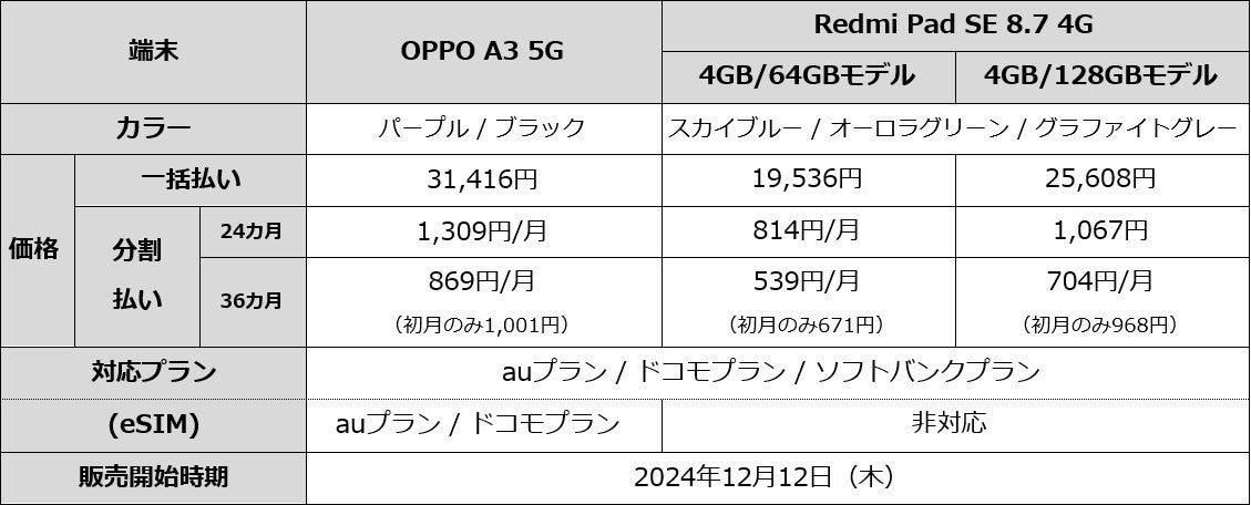 株式会社オプテージ(大阪市中央区)は、携帯電話サービス「mineo(マイネオ)」において、「OPPO A3 5G」「Redmi Pad SE 8.7 4G」の販売を2024年12月12日(木)より開始いたします。