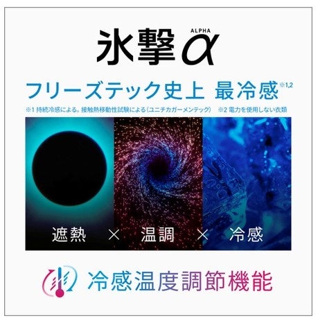 酷暑環境や体温上昇などで熱せられる衣服内温度を快適域に近づける効果により、 “氷撃”冷感プリントの冷感効果を実感アップさせた商品。