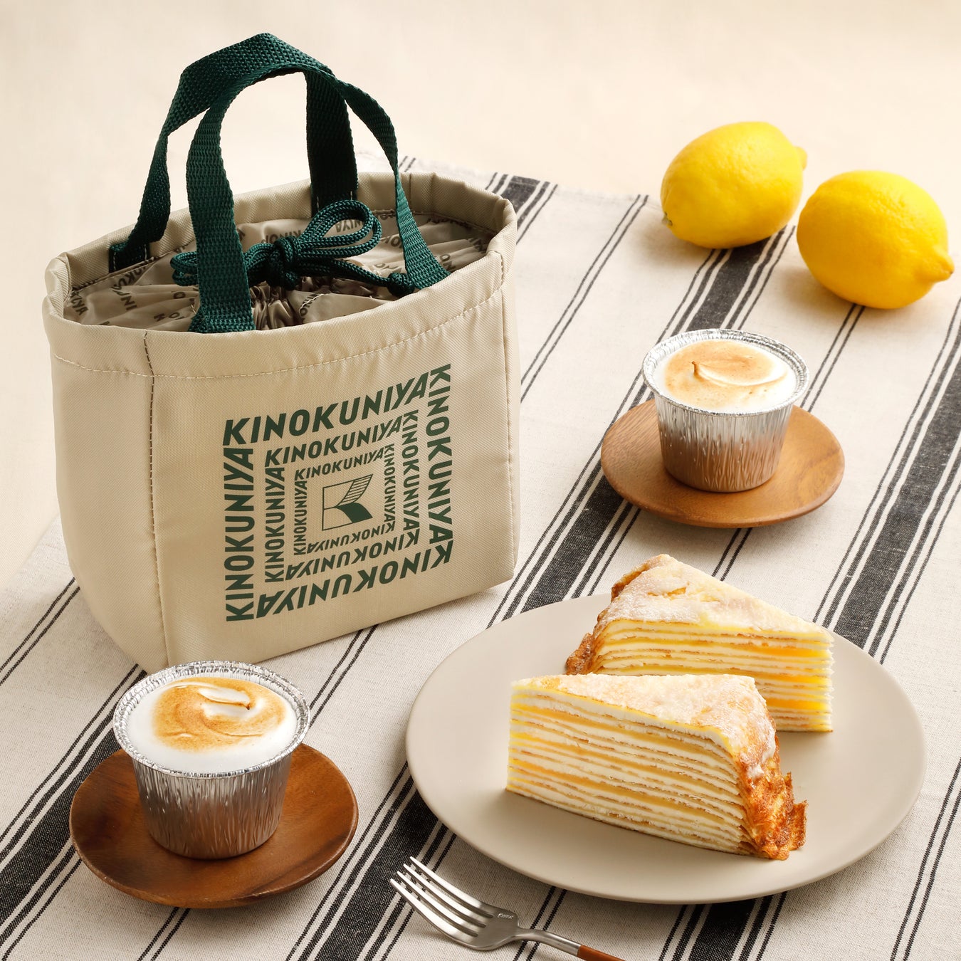 紀ノ国屋公式オンラインストアでは、爽やかなレモンスイーツ「ミルクレープ(レモン)」と「メレンゲレモンパイ」の2種類と「ミニ保冷バッグ」をセットにした「紀ノ国屋 レモンデザートセット(ミニ保冷バッグ付き)」を公式オンラインストア限定で販売中です。