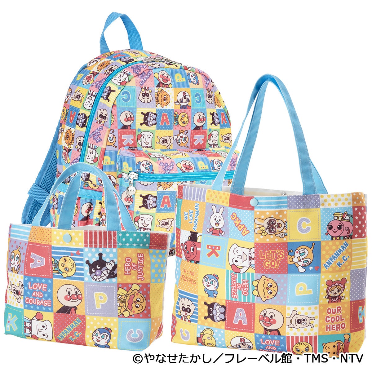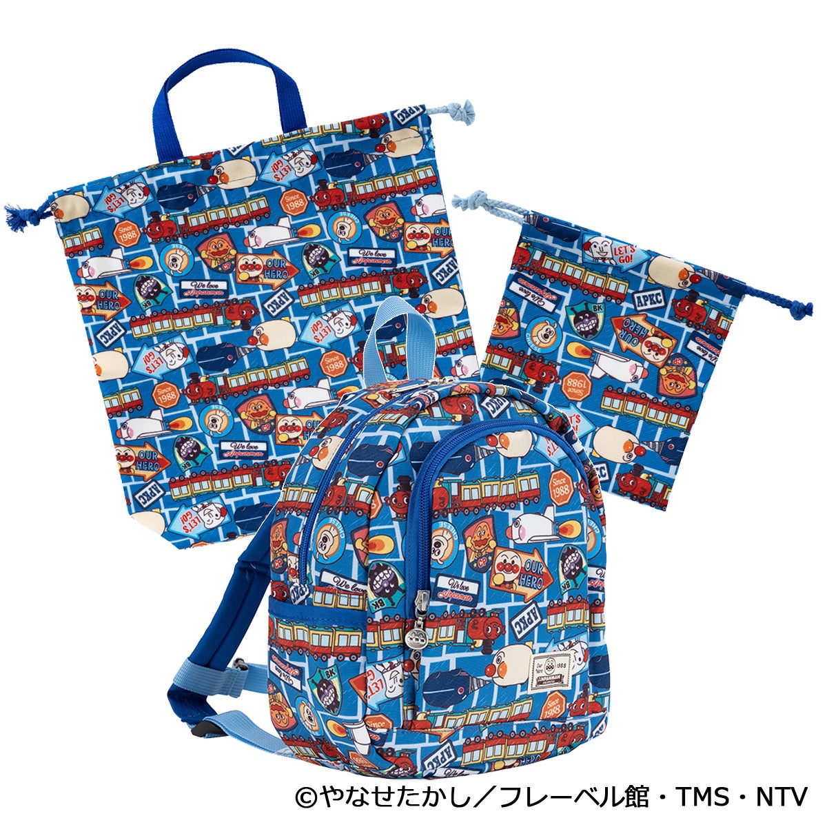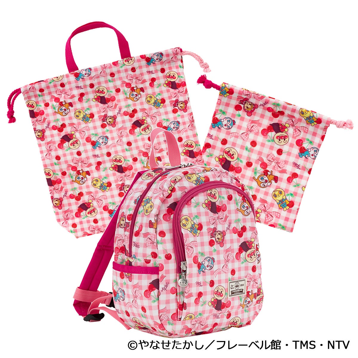 アンパンマンとなかまたちがカラフルなフレームに並んだ「フレーム柄」、アンパンマンごうやもぐりん、SLマンなどが描かれた「のりもの柄」、さくらんぼやリボンが入ったピンク色のギンガムチェックにアンパンマンをはじめドキンちゃんなどのなかまたちがデザインされた「さくらんぼ柄」を使用した、リュックや巾着など、入園準備や、通園の際に活躍するアイテムを多数展開いたします。
