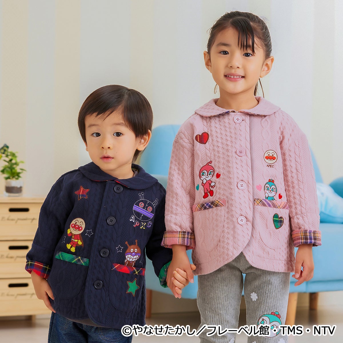 刺繍でデザインされたアンパンマンたちとヘチマ衿が上品なキルトコート。