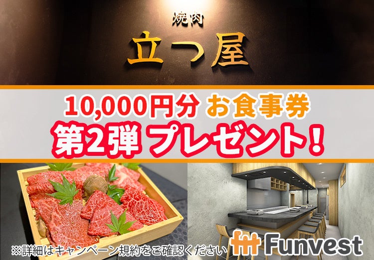 本ファンドに300万円以上の出資でもれなく『焼肉 立つ屋 お食事券(10,000円相当)』をプレゼント!