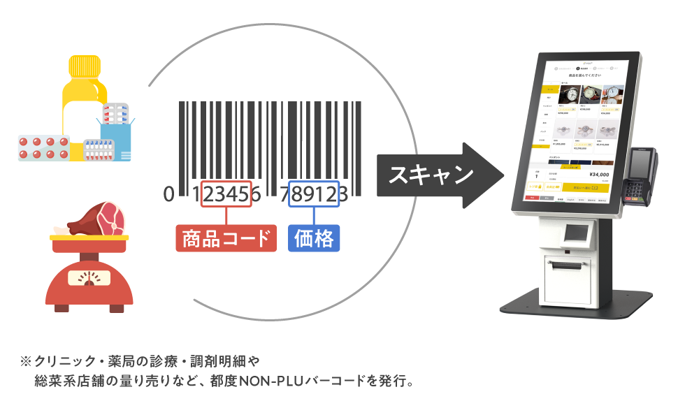 ~クリニック・薬局の診療・調剤明細や総菜系店舗の量り売りなど都度発行されるNON-PLUバーコードを読み込むことでセルフ会計が可能に~