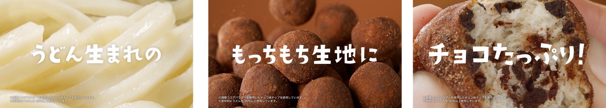 販売開始以来、他では味わうことのできない、もっちもちの食感と季節ごとに変化する味わいに、たくさんのお客さまにご好評いただいています。さらに楽しんでいただくため、この冬、製法が進化しました。これまでは、「丸亀うどーなつ」に様々な味わいのパウダーをかけてお楽しみいただいておりましたが、生地にも素材を練り込む新製法として“しあわせもっちもち製法”を開発。『丸亀うどーなつ チョコ味』の、しあわせたっぷりな味わいを実現しました。