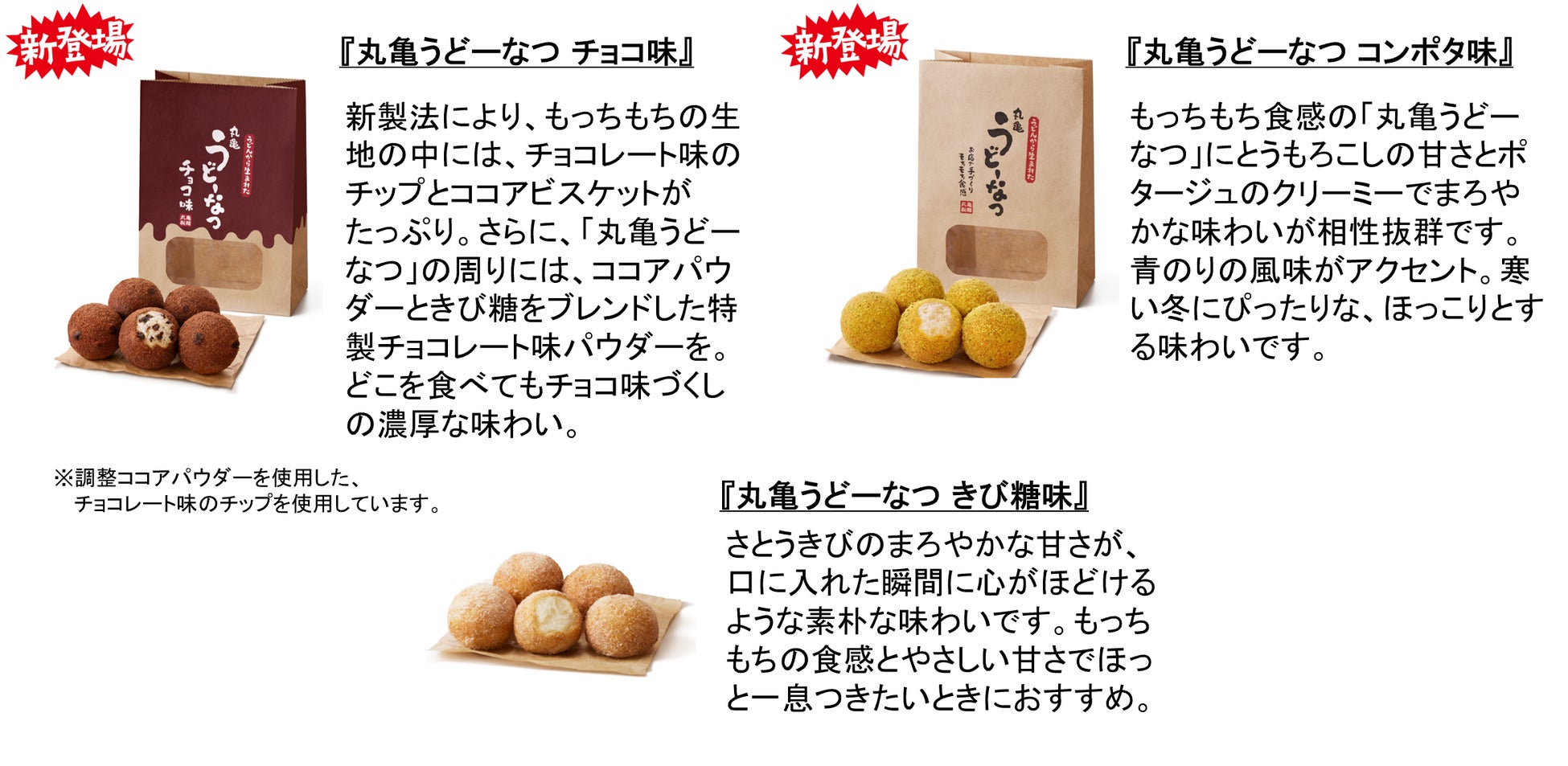 この冬は、『丸亀うどーなつ チョコ味』、『丸亀うどーなつ コンポタ味』の2種類が新しく登場します。『丸亀うどーなつ チョコ味』は、生地にもチョコレート味のチップやココアビスケットが練り込まれた、今だけの濃厚でリッチな味わい。『丸亀うどーなつ コンポタ味』は、もっちもち食感のうどーなつによく合う、コーンポタージュのクリーミーなまろやかさが特徴。冬にぴったりな、どこかほっこりする味わいです。