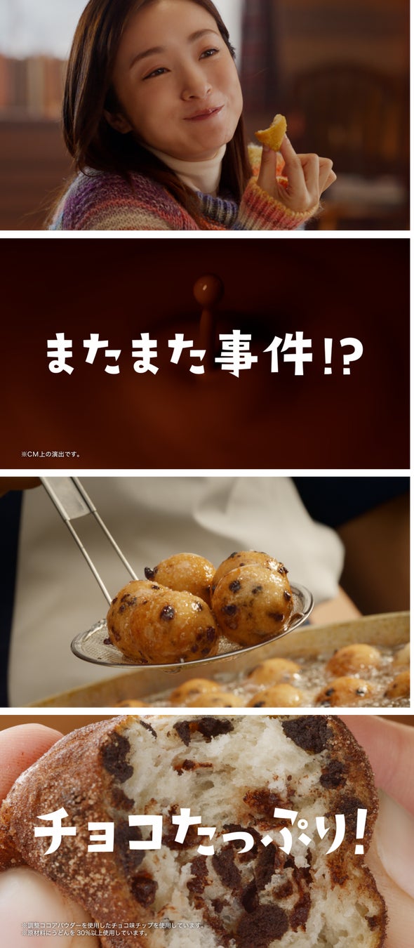 今回のTVCMは、まるで映画の予告のような、疾走感のある仕上がりとなっています。驚いた表情の上戸さんが振り向くシーンから始まり、「丸亀うどーなつに、またまた事件です!」というナレーションとともに、わくわくした感情を抑えきれない様子で「チョコ!?」と問いかけながら駆け込んでくる原さんが登場。「うどん生まれのもっちもち生地に、しあわせチョコがたーっぷり!」とナレーションが流れる傍らで、もっちもちの生地にチョコレート味のチップやココアビスケットがたっぷり練り込まれた、揚げたての『丸亀うどーなつ チョコ味』が画面いっぱいに映し出されます。原さんが「チョコ味」をひと口頬張り、口いっぱいに広がる「チョコ味」ともっちもち食感に幸せそうな表情を浮かべ、上戸さんは「コンポタ味」のもっちもち食感のうどーなつによく合う、コーンポタージュのクリーミーなまろやかさに、至福の表情を浮かべます。そして、「もっちもちが、止まりません!」と声を合わせます。そして、濃厚でリッチな味わいの「チョコ味」とコクのあるまろやかさが特長の「コンポタ味」、やさしい甘さの「きび糖味」の3種類が映し出され、「これは幸せな事件です」というナレーションに合わせ、上戸さんは暖かなお家の中で友人とともに、原さんは楽しげな街中で、「丸亀うどーなつ」をぱくりと頬張る様子が流れます。その後、もっちもちの食感の「丸亀うどーなつ」のおいしさに、微笑み目を丸くするお二人の様子でTVCMは締めくくります。