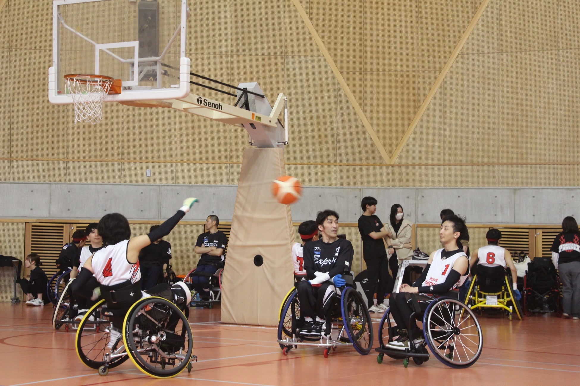車いすバスケットボールの1種でもあるツインバスケットボール体験。デモ試合の実施に加え、選手と一緒にバスケ車の操作やフリースローを体験!