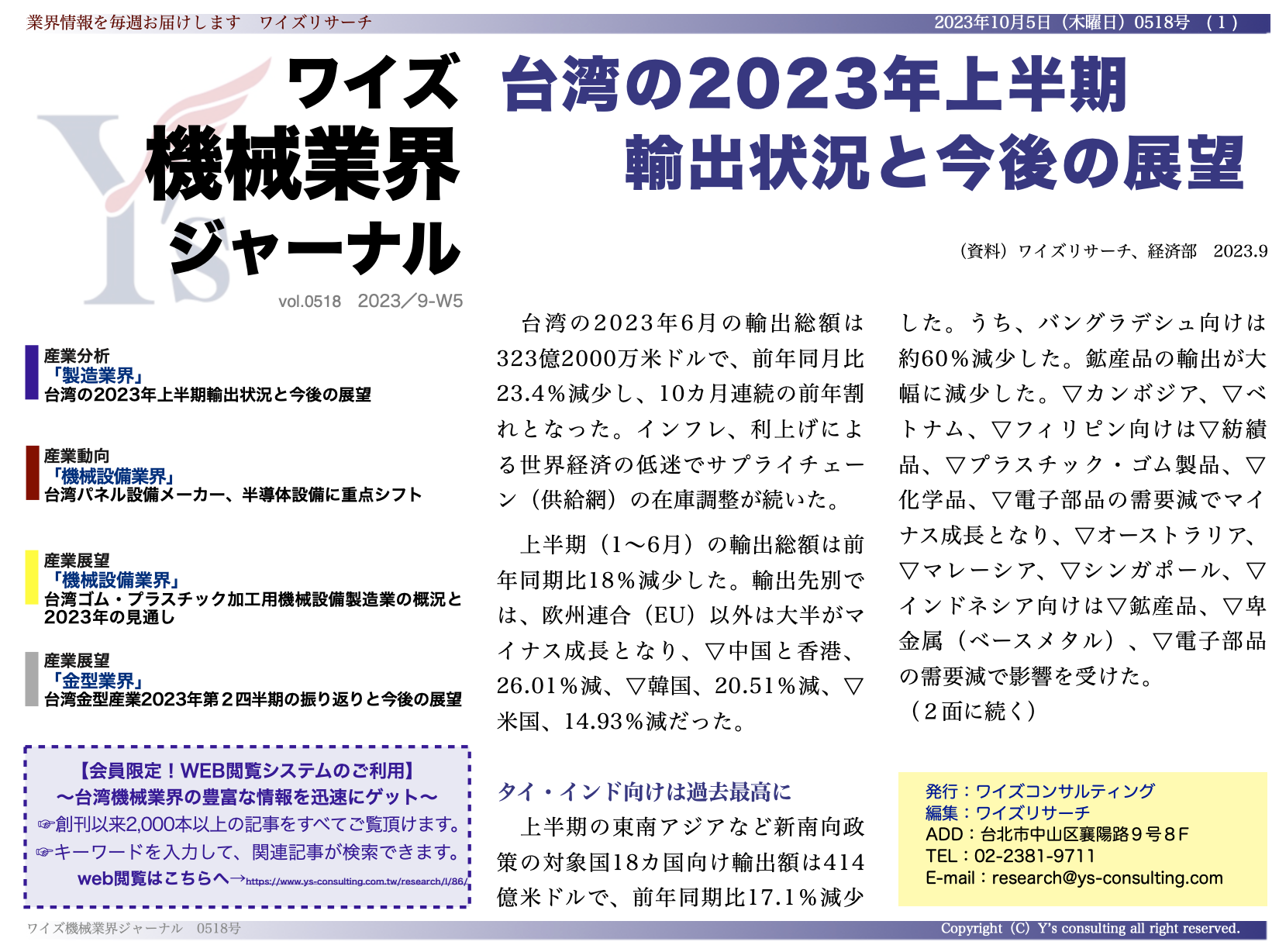 【台湾情報】台湾パネル設備メーカー、半導体設備に重点シフト<ワイズ機械業界ジャーナル2023年10月第1週号発行>