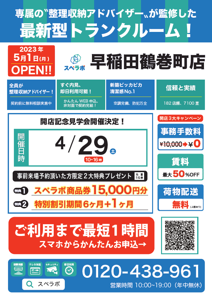 【早稲田鶴巻町店/5月1日(月)オープン】見学から契約、解約まで完全非接触・非対面、お申し込みからご利用まで最短1時間!都内、大阪などにて絶賛運営中のトランクルーム【スペラボ】が早稲田駅近くに出店!