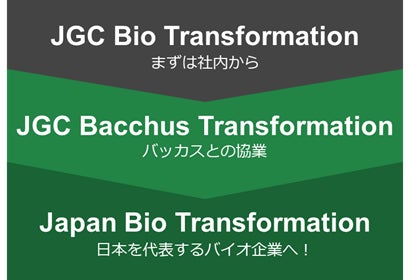 研究棟の通称に用いている「JBX」という言葉には、まずは日揮HD社内でバイオへの変革を起こす「JGC Bio Transformation」から始まり、日揮HDとバッカスの協業を強化して確固たるものにしていく「JGC Bacchus Transformation」、そして将来的には日本を代表するバイオものづくりの企業となり、日本全体でバイオものづくり産業を推進させていく「Japan Bio Transformation」という本事業の将来への期待を込めています。なお、JGCは、日揮HDの英文社名「JGC HOLDINGS CORPORATION」の略称です。