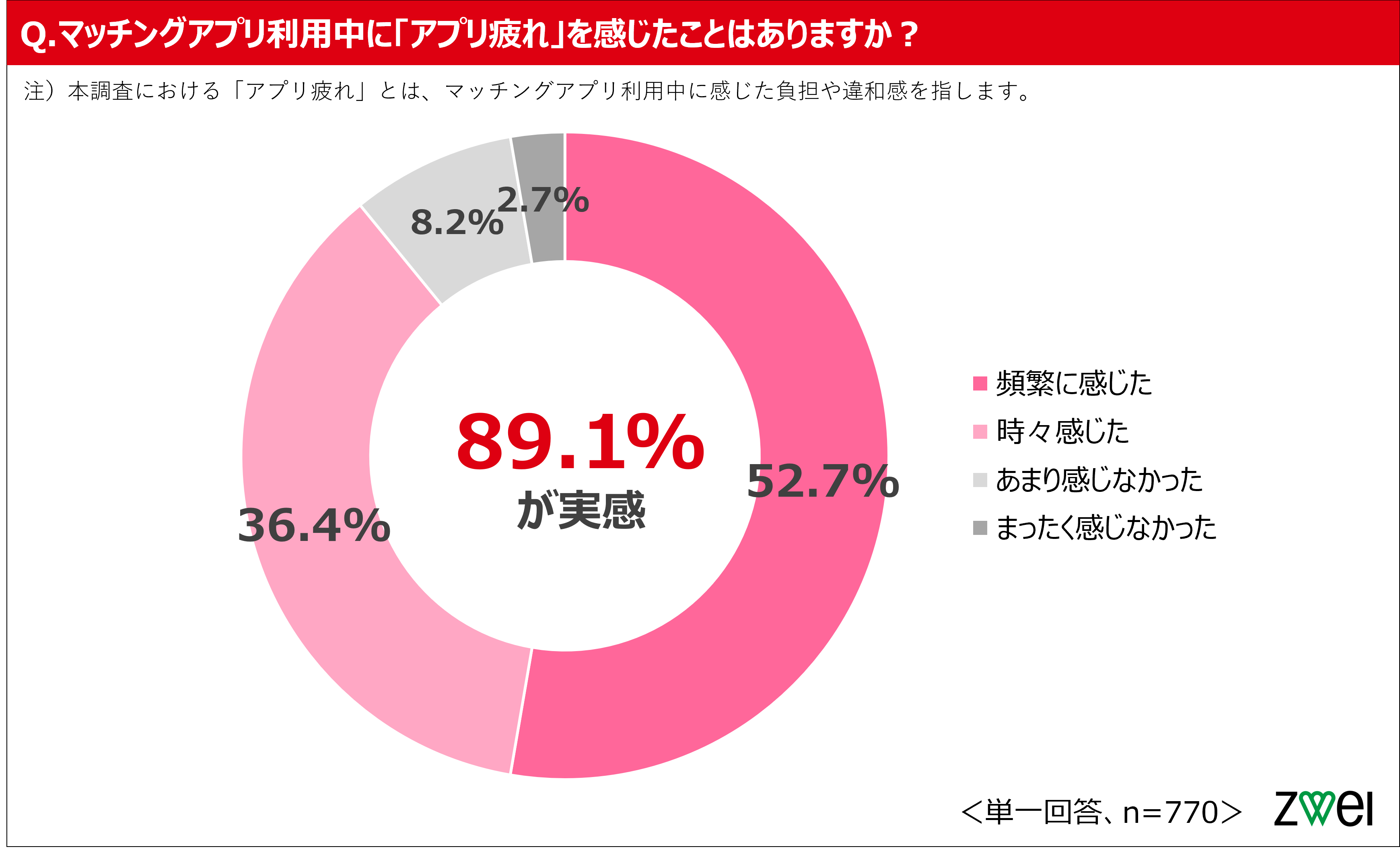 ZWEI現会員の男女1,064名を対象に調査したところ、マッチングアプリの利用経験がある人は72.4%でした。さらに、マッチングアプリ利用経験のある770名に「アプリ疲れを感じたことがあるか」を聞いたところ、「頻繁に感じた」52.7%、「時々感じた」36.4%となり、合わせて89.1%がアプリ疲れを感じたことがあることが明らかになりました。一方で、「まったく感じなかった」はわずか2.7%にとどまりました。
