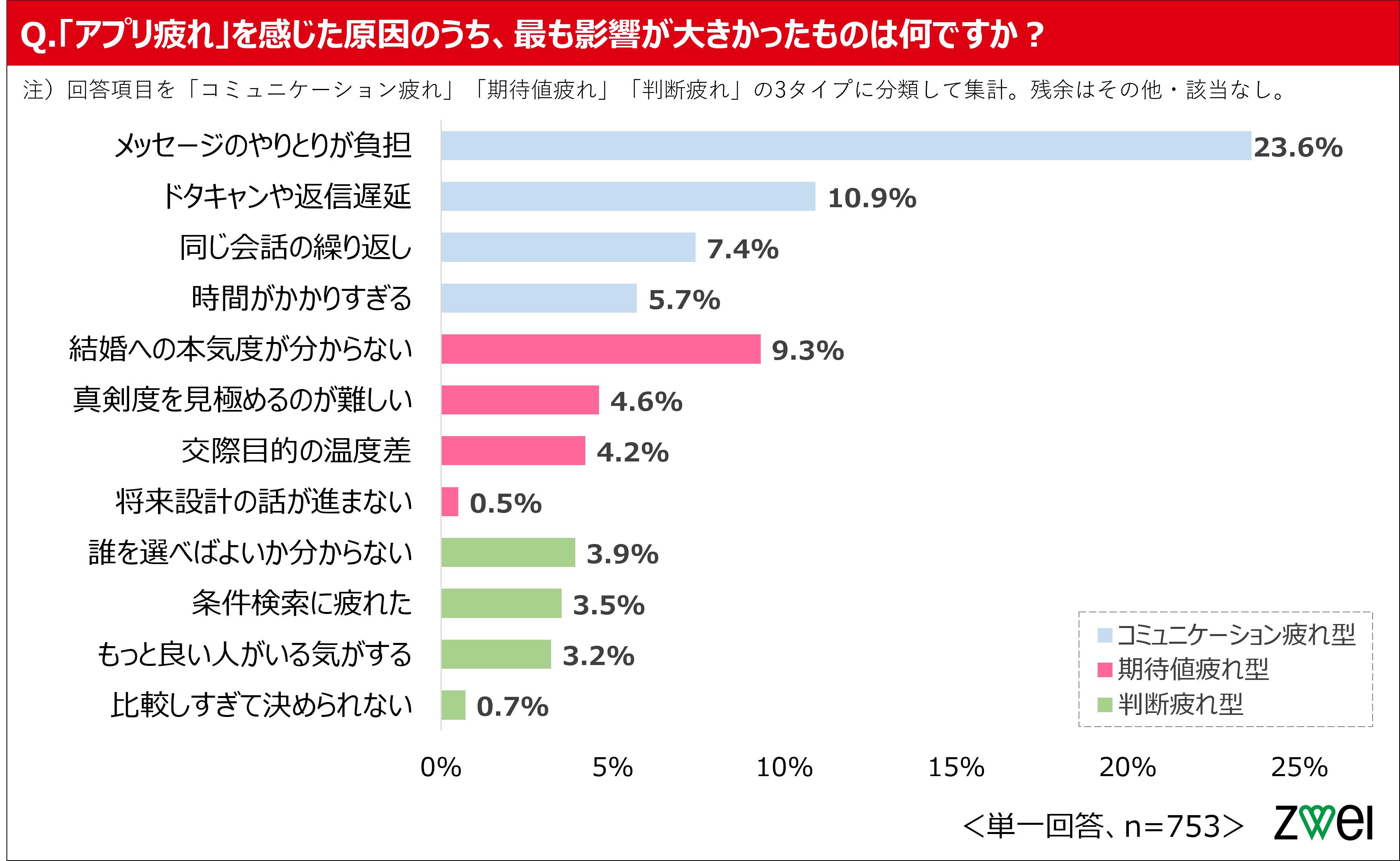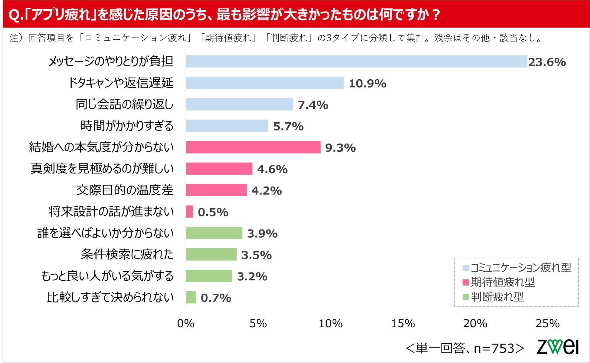 アプリ疲れの原因を「コミュニケーション疲れ」「期待値疲れ」「判断疲れ」の3タイプで整理すると、最も影響が大きかった原因では約半数(47.6%)が「コミュニケーション疲れ」型に該当。「コミュニケーション疲れ」型の中でも特に「メッセージのやりとりが負担」は全項目トップの23.6%で、4人に1人が最大の原因として挙げました。次いで、相手の結婚への本気度や温度差への不安から生じる「期待値疲れ」型が18.6%、誰を選ぶべきか迷うなど選択・判断の難しさに起因する「判断疲れ」型は11.3%となりました。