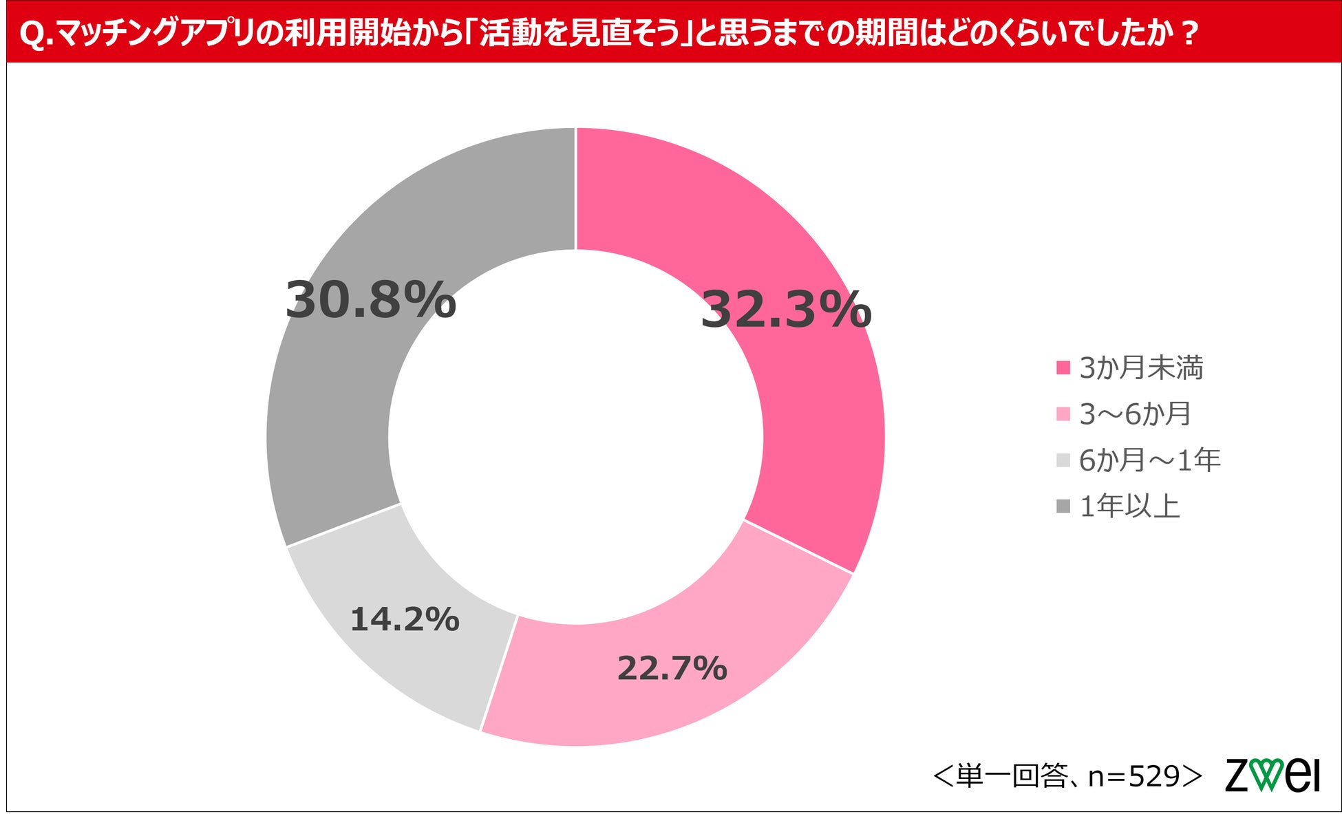 婚活の見直しを決めた529名のうち、32.3%が「3か月未満」で早期に転換を決断した一方、転換までに1年以上を要した層も30.8%にのぼり、早期に判断する層と長期化する層がそれぞれ約3割存在する結果となりました。