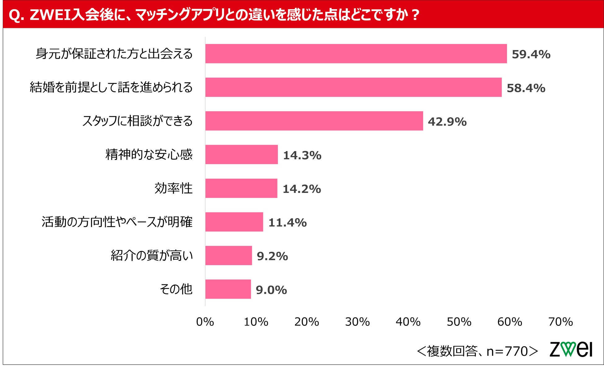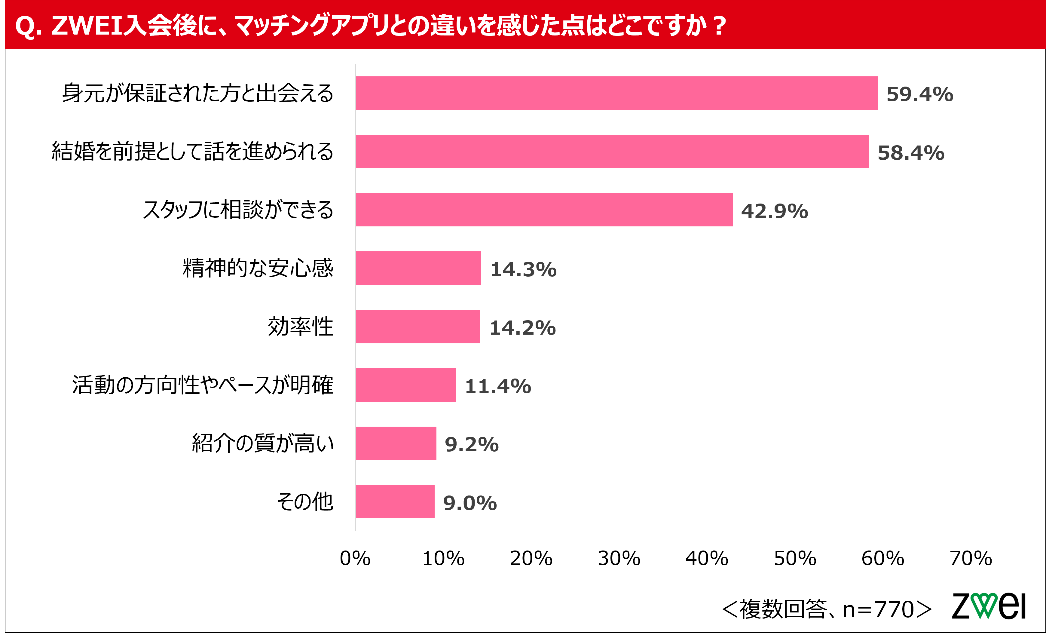 ZWEI入会後に感じた違いは「身元保証された方と出会える」59.4%、「結婚前提で話を進められる」58.4%が上位に