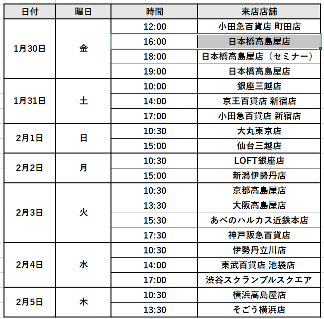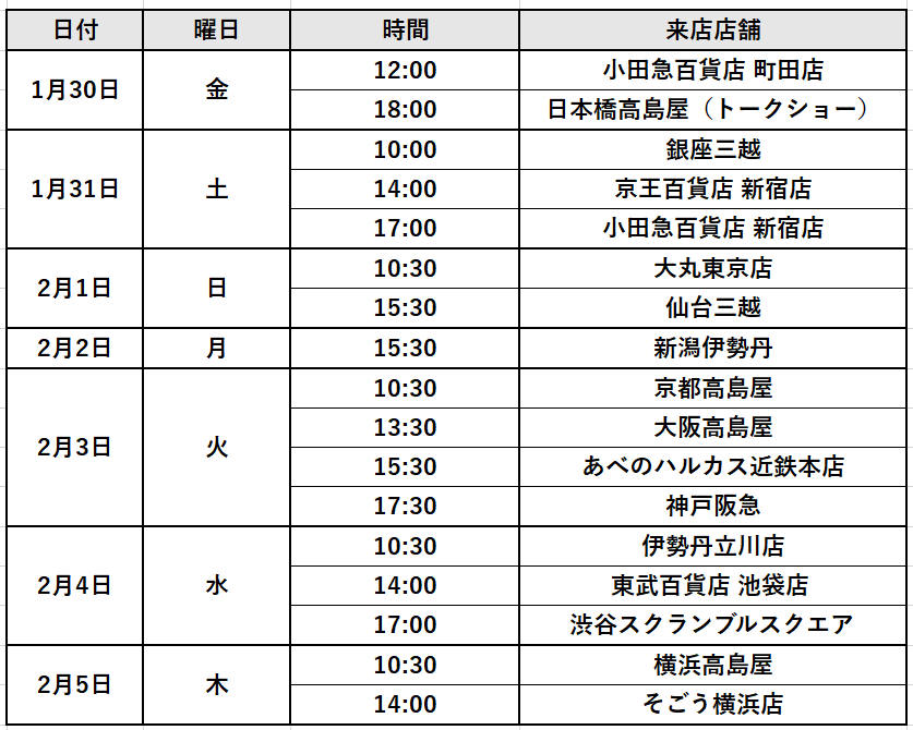 ※ 感染症対策等、各百貨店の都合により、上記日時は変更になる場合があります。