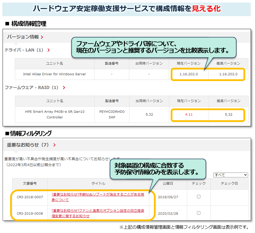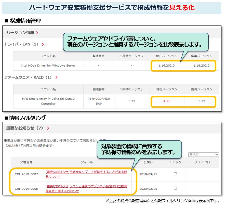 業務の集約度が上がりより重要度を増したシステムの安定稼働を継続していくためには、サーバのファームウェア・ドライバの既知不具合による障害発生を未然防止することが重要です。このたび、標準的な保守サービスメニューを強化し、当日対応のオンサイト保守作業や問題解決支援等に加えて、ハードウェア安定稼働支援サービスを1年間無償で提供いたします。ハードウェア安定稼働支援サービスでは、お客様専用サイトで、ハードウェア構成やファームウェア・ドライバ情報といった「構成情報」を提供するとともに、お客様の構成に該当する「重要なお知らせ/セキュリティ情報/アドバイザリ」を抽出しバージョン選択のサポートをいたします。これらにより、ファームウェア・ドライバのバージョン管理や更新作業の手間を削減し、作業漏れの予防を支援します。