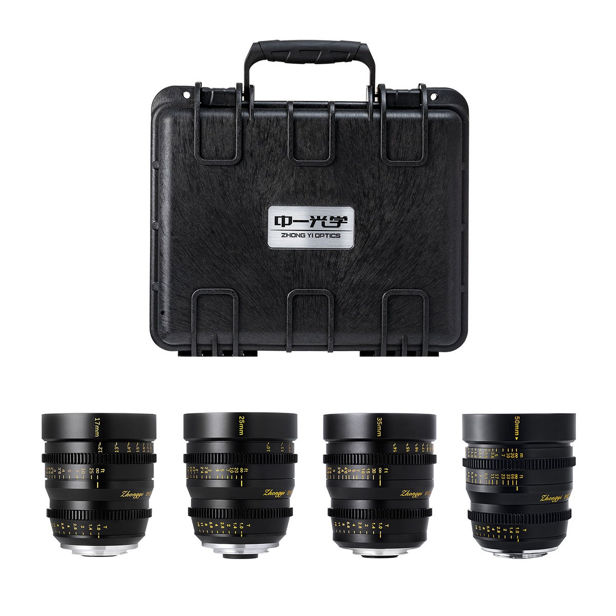 SPEEDMASTER CINEMA 「17mm T1.0」「25mm T1.0」「35mm T1.0」「50mm T1.0」の4本セットです。35mm判換算34mm~100mm相当をカバーするセットで、風景やポートレートなど様々なシーンで中一光学のシネマレンズを楽しめます。防塵防滴の頑丈なハードケースが付属し、レンズを安全に持ち運ぶことができます。