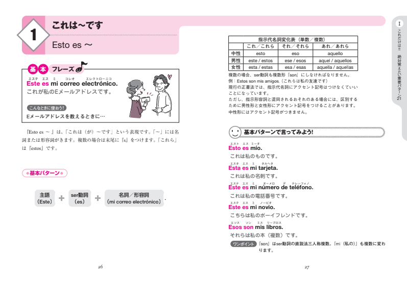 「~はどう?」「~したいです」など、会話でよく使うパターン(文型)を身につければ、スペイン語で言いたいことが表現できるようになります。