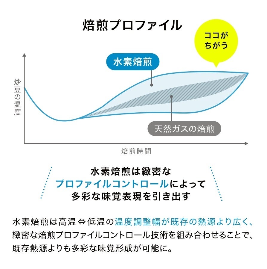 水素焙煎で引き出せる特性はコーヒー豆の種類(産地)によって異なります。水素焙煎の特性を活かして、酸味形成に重要な温度帯をゆっくりと通過するように焙煎プロファイルをコントロールした結果、フレーバーと酸味の質において、よりフルーティ・フローラルであると有意な差を得ることができ“水素焙煎ならではのおいしさ”を創り出すことができました。