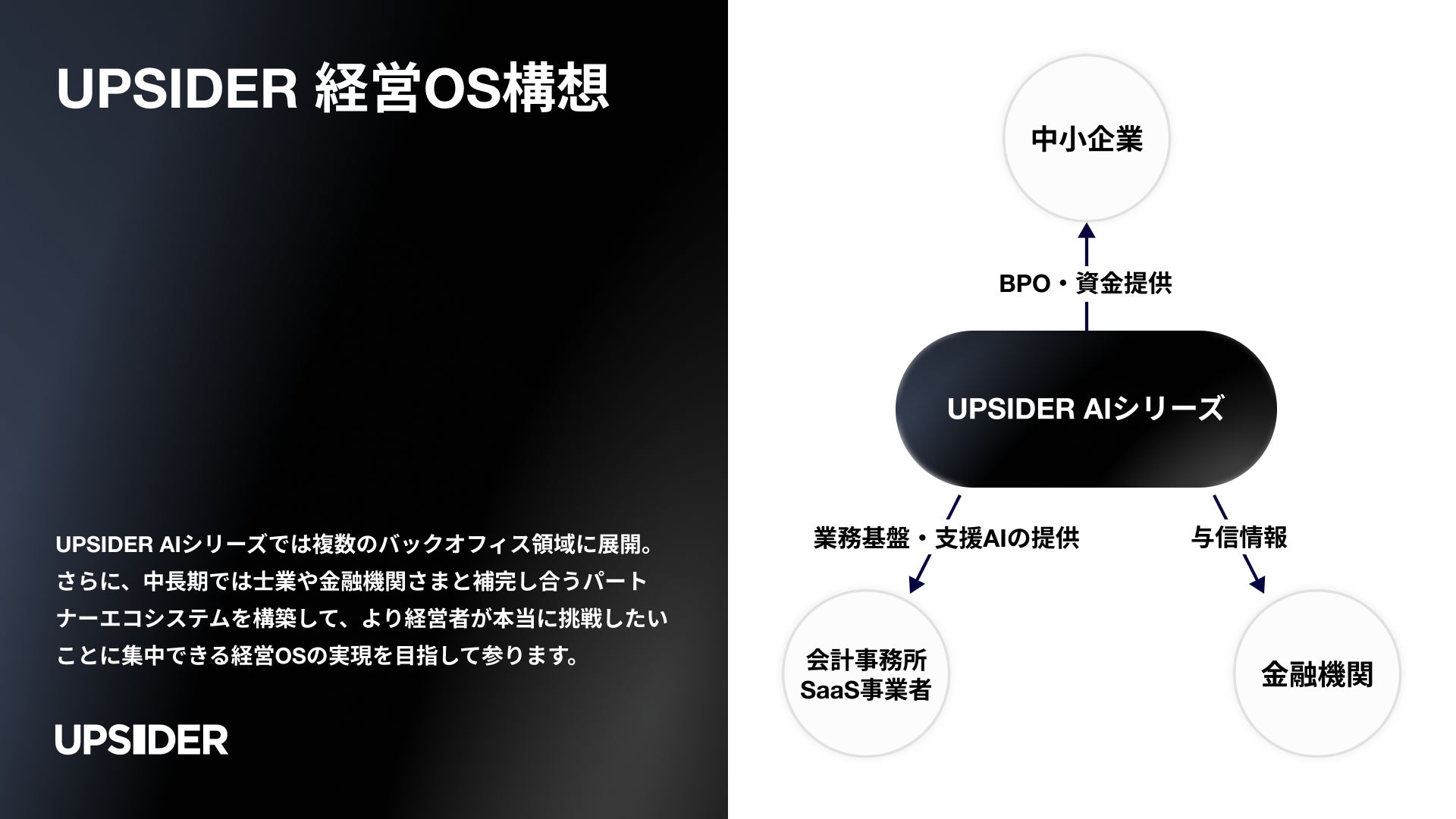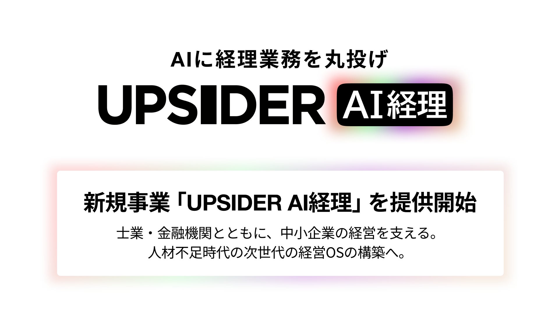 当社は、中小企業と士業、金融機関の三者が直面する人手不足という構造課題に向き合い、将来的にあらゆる経営支援サービスと連携する「UPSIDER経営OS構想」の実現に向け、第一歩目としてUPSIDER AI経理をリリースいたします。また、今後、経理業務以外の幅広い領域にもサービスを展開してまいります。