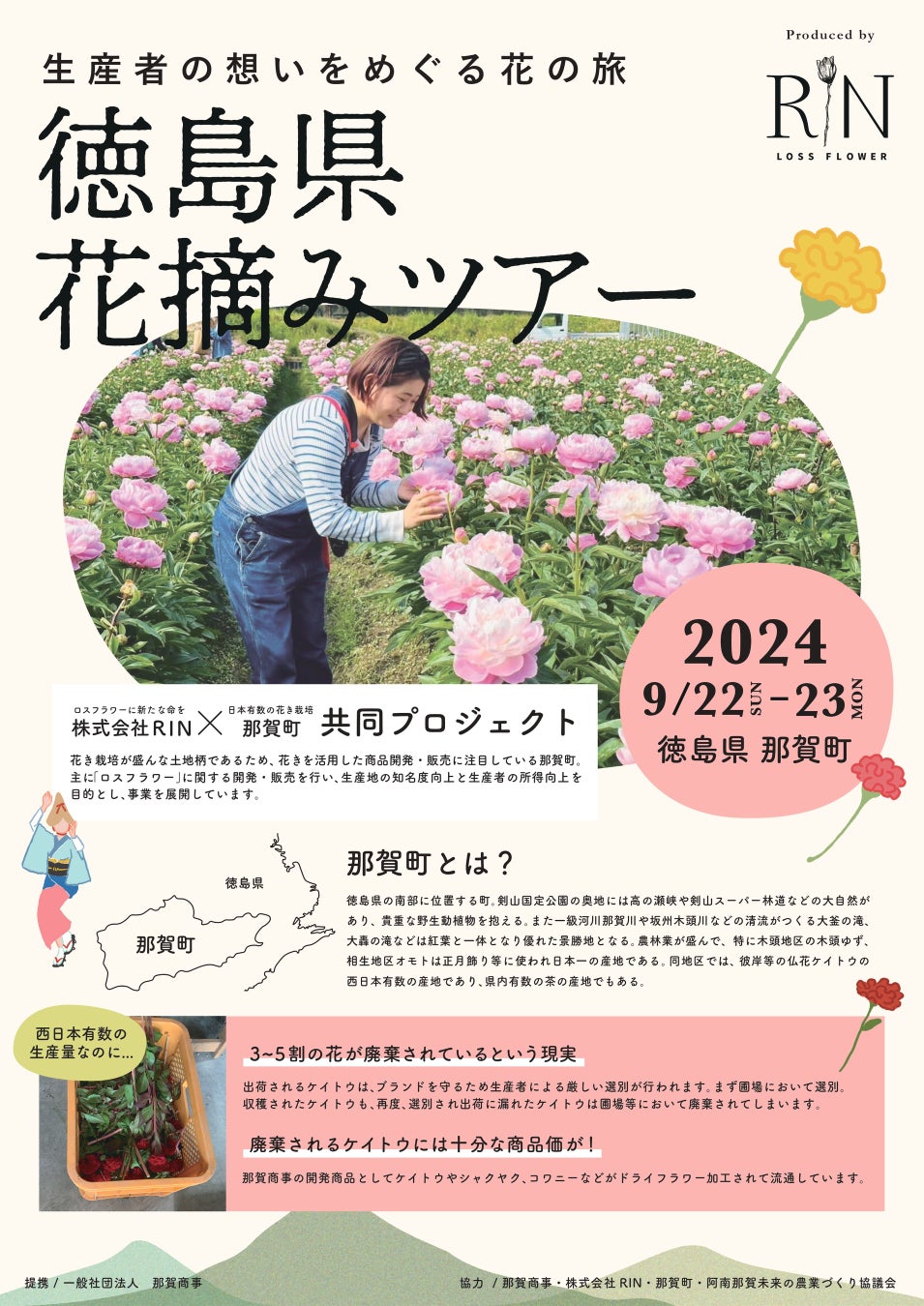 徳島県那賀町は、花の栽培が盛んな町です。四季折々の花が咲く美しい町で、那賀町と一般社団法人那賀商事、そしてRINは花摘みツアーを企画。今年4月、全国のベアミネラル カウンターのディスプレイを彩った、ロスフラワーを展開している花生産農家を回り、収穫やフラワーアレンジメントなどを体験してもらうことによって、「ロスフラワー®︎」のこと、花農家さんの大変さや想いなどを肌で感じ、花がもっと身近な存在に、生活の中に入り込んでいき、「花のある生活を文化にする」という想いを込めて開催します。