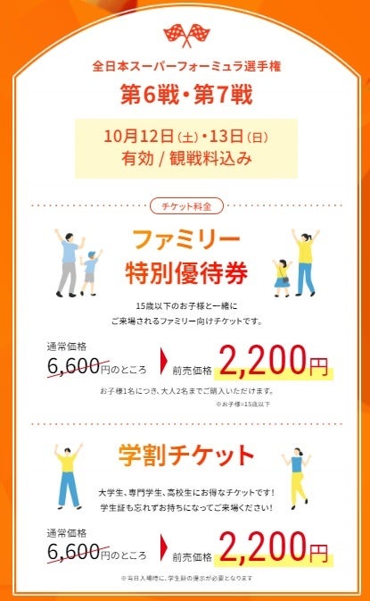 2024全日本スーパーフォーミュラ選手権第6戦・第7戦の前売観戦券や、その他の券種についてはチケットサイトをご参照ください。