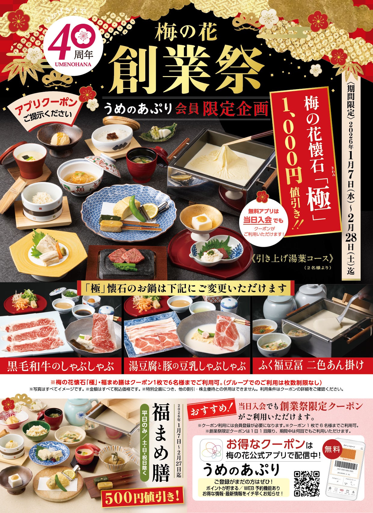 株式会社梅の花サービス(本社:福岡県久留米市、代表取締役:野田安秀)が運営する「湯葉と豆腐の店 梅の花」では日頃のご愛顧への感謝を込めて、2026年1月7日(水)~2月28日(土)の期間中、公式アプリ会員様限定の創業祭を開催いたします。